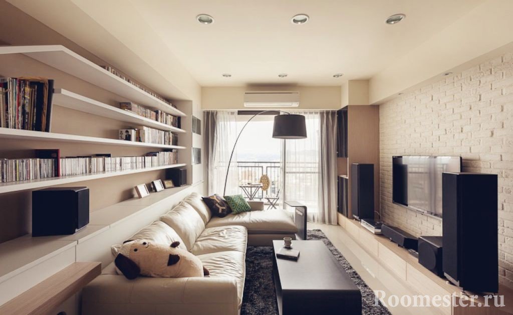 Experimenta amb textures i detalls brillants, pots retallar una part de la paret sota un maó o utilitzar panells de suro. Feu servir imatges grans, cartells brillants. Una altra gran solució per diversificar l’interior d’una llarga estreta habitació són nínxols a les parets, que es converteixen en un autèntic element destacat en el disseny i permeten desfer-se de l’efecte túnel de la sala.