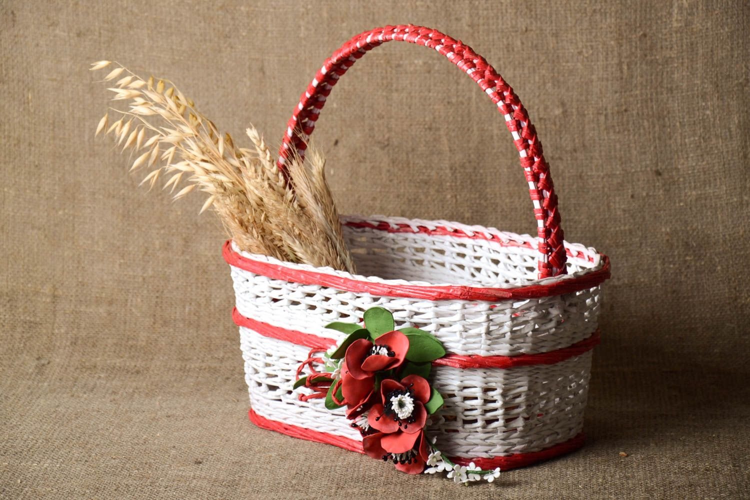 At væve en lille kurv vil vise sig selv fra en almindelig plastikbæg, mere præcist, fra to, helst forskellige farver. Den ene skæres i centimeterstrimler fra kanten og ned, den anden er spiralformet vævet ind i den første. Håndtaget er lavet af bølgepap. Der er en anden mulighed - glasset skæres på samme måde som den første, men ikke til bunden. Striberne er bøjet med ringe, håndtaget er limet. Produktet er dekoreret med blomster fra silkepapir, pelskyllinger, farvede bånd.