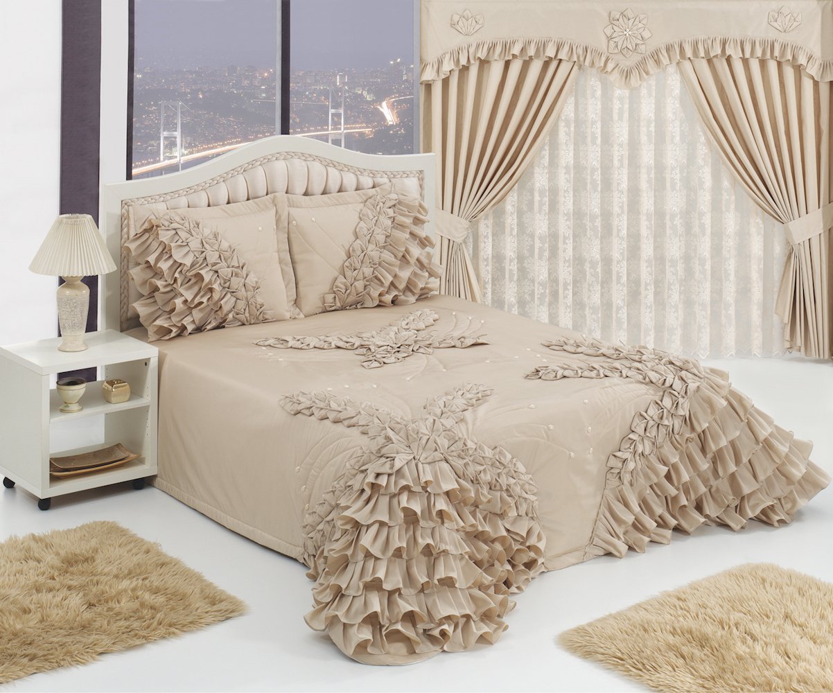 El producto con un aspecto se ve lujoso, caro, especialmente si está hecho de material de calidad. La supervisión se cose a lo largo del perímetro de las colchas, con menos frecuencia; se usa como un producto independiente en forma de una "falda" en una banda elástica que oculta las patas de la cama. En el pasado, las camas, el siglo anterior, eran mucho más altas para dormir más cálidas, había mucho espacio debajo de ellas, estaba bellamente cubierto, decorado con bordados con un significado sagrado.