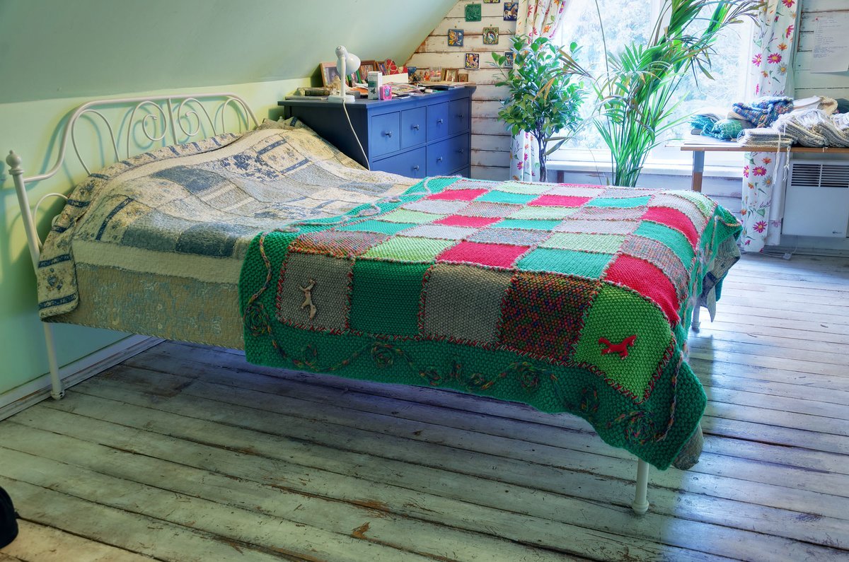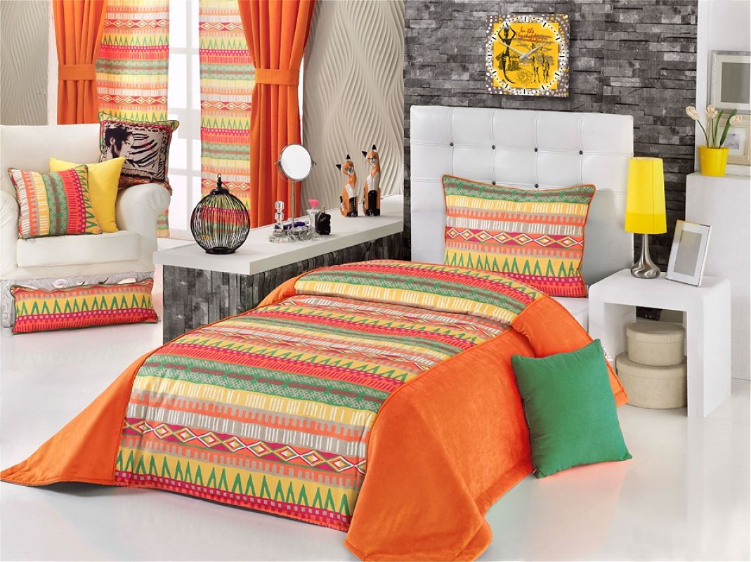 En algunos productos, se obtiene un patrón, debido a un cierto entrelazado de hilos; en otros, se imprime un patrón. Hay materiales que no se pueden teñir, como el pelo de camello; sigue siendo de color amarillo-marrón. En el dormitorio, se eligen tonos suaves y tranquilos, pero correspondientes a las preferencias personales de una persona en particular. Para colchas en un sofá, se utiliza un sillón en la sala de estar en cualquier color adecuado para el estilo.