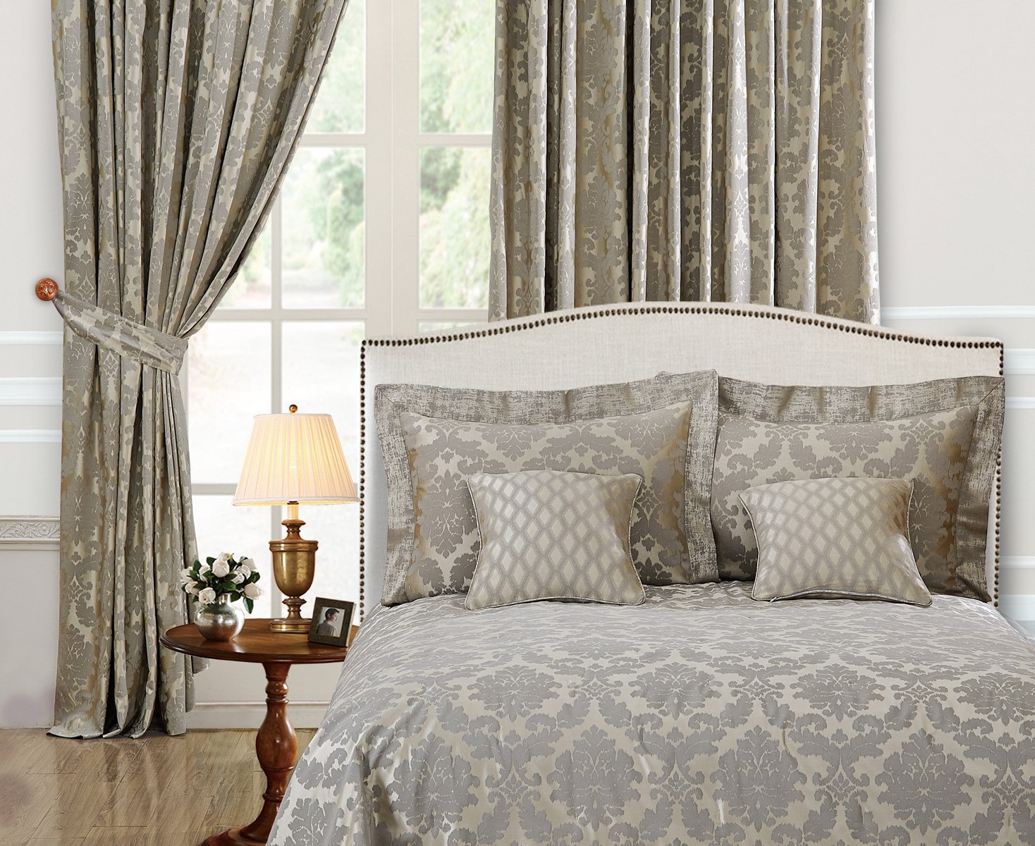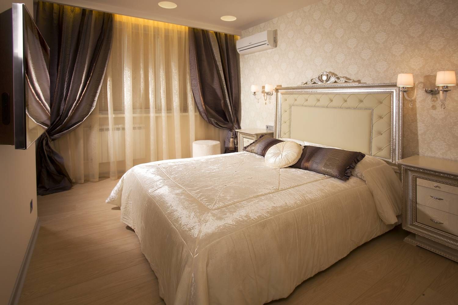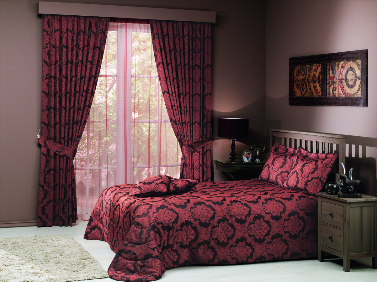 Mucho también depende de la iluminación, el tamaño de la habitación: para habitaciones estrechas con pequeñas ventanas que dan al lado norte, se seleccionan cortinas de los colores más claros y cálidos con un patrón pequeño y raro, o completamente sin él. Es mejor evitar los contrastes agudos. Si el espacio es grande, las ventanas son panorámicas, mirando hacia el lado sur brillante, el patrón en las colchas es grande, brillante, y ellos mismos son seleccionados por colores oscuros y fríos.