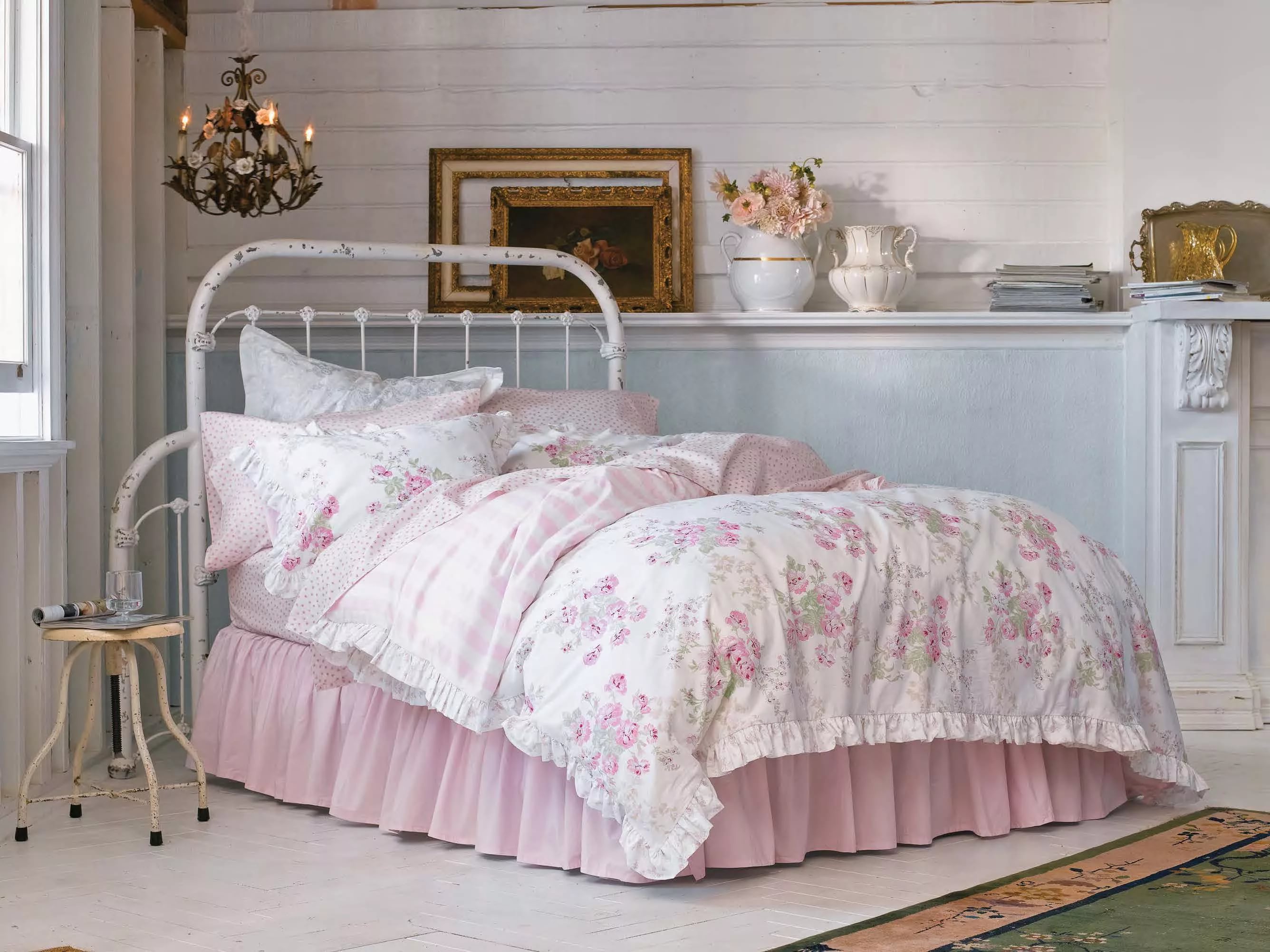 Este diseño es adecuado para barroco, imperio, romántico y algunos otros. Los volantes suaves y cosidos a mano son un poco problemáticos, especialmente para los principiantes, por lo que debes usar una máquina de coser. Cada elemento decorativo también se corta de forma ligeramente diferente. Una decoración lujosa es necesaria cuando se quiere hacer de la cama el centro semántico de la habitación, su énfasis principal. No es recomendable usarlo en una habitación pequeña, existe el riesgo de acercarlo aún más.