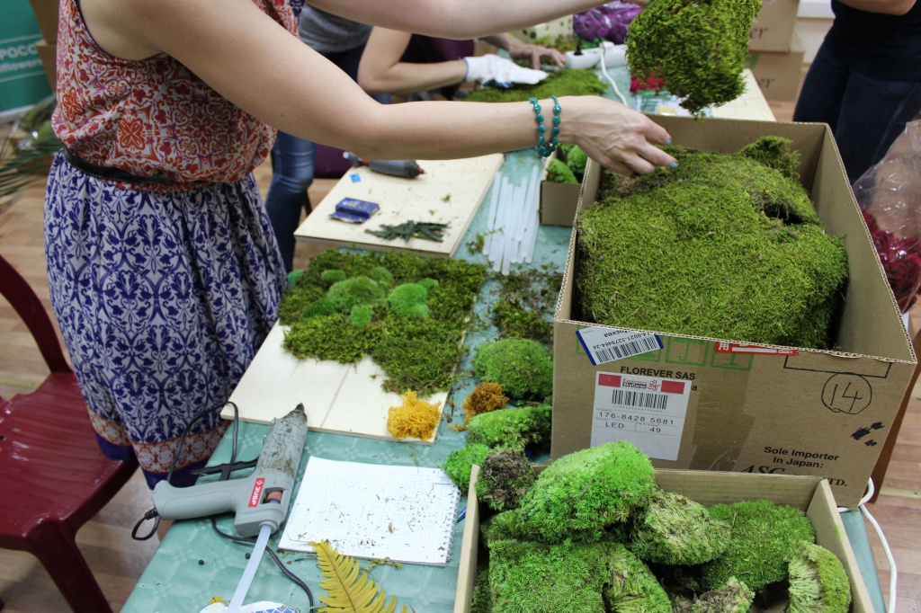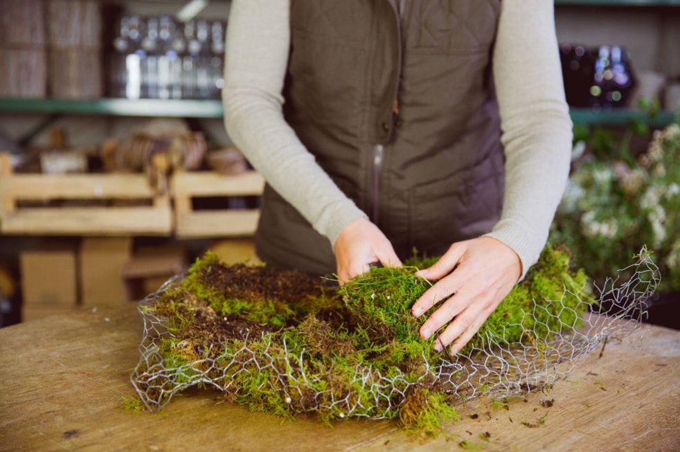 Es necesario pensar en los puntos principales, determinar la orientación del producto: horizontal o vertical, decidir si estará completamente cubierto de musgo o si la planta se usará fragmentariamente.