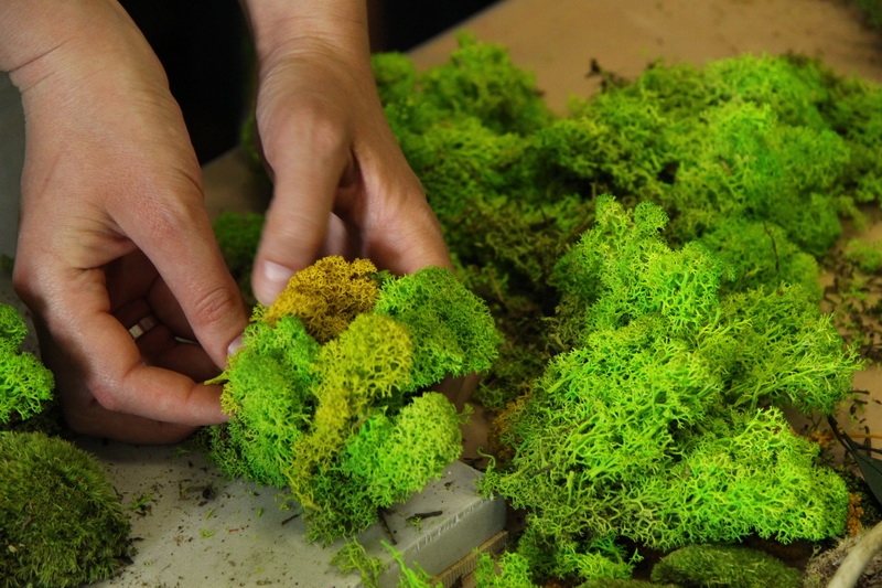 Para la preparación de composiciones, se utiliza con mayor frecuencia el musgo de reno, que tiene un atractivo color verde brillante. Además, es más fácil llegar a nuestras latitudes geográficas. Se ha demostrado a sí mismo como una decoración de calle marco y esculturas interiores, paneles.
