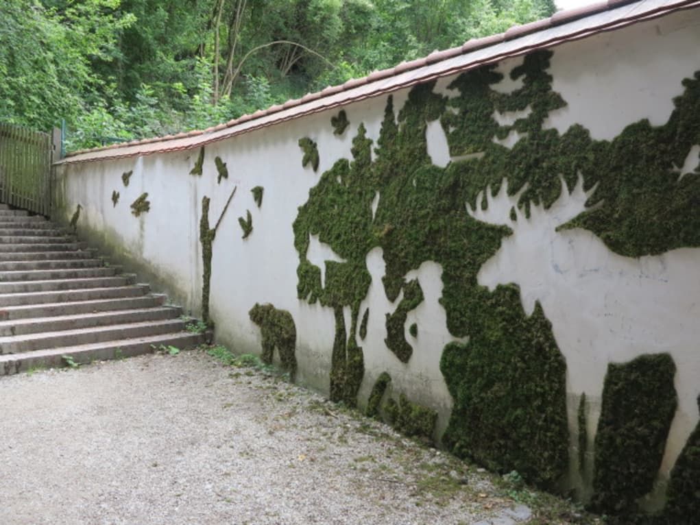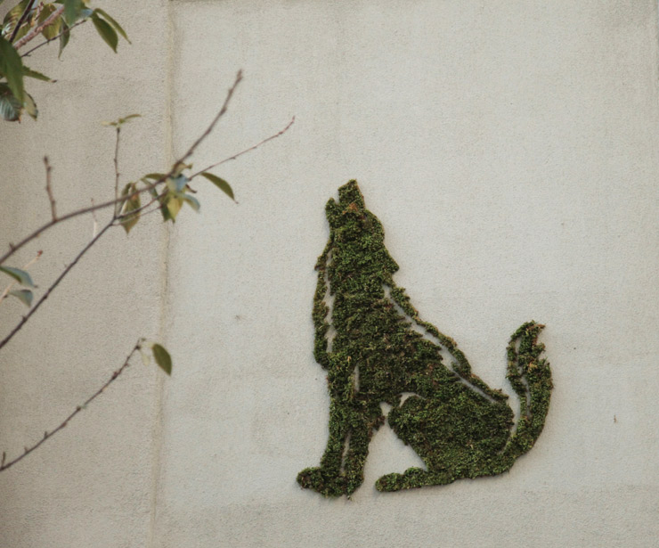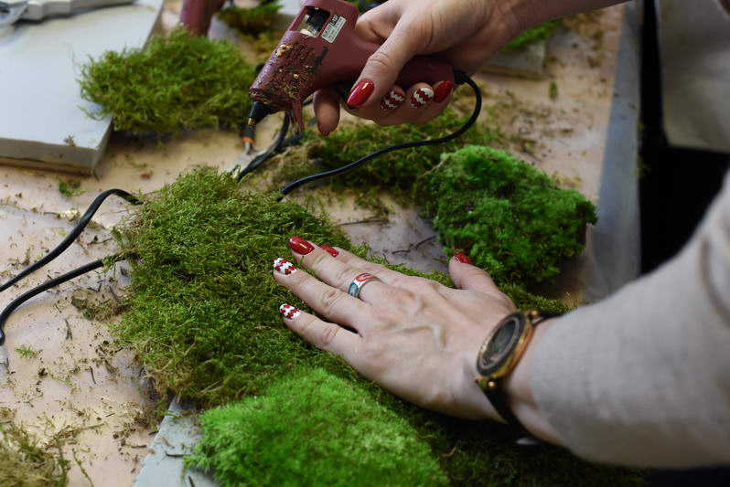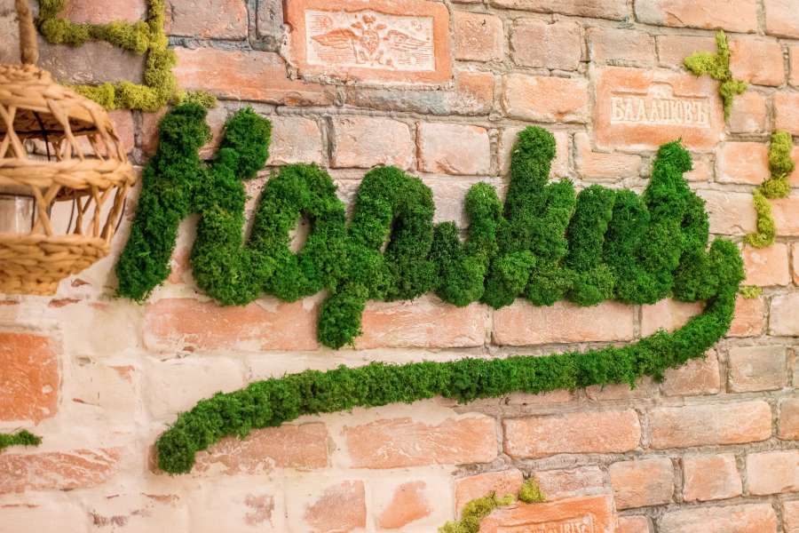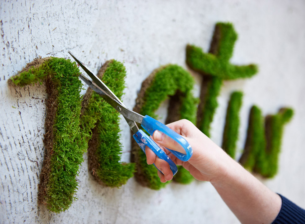 Pegando musgo. Las cartas primero deben dibujarse en papel o imprimirse una plantilla de Internet. Según su tamaño, las letras se cortan de la capa de musgo y se fijan en la pared con cinta adhesiva de doble cara.