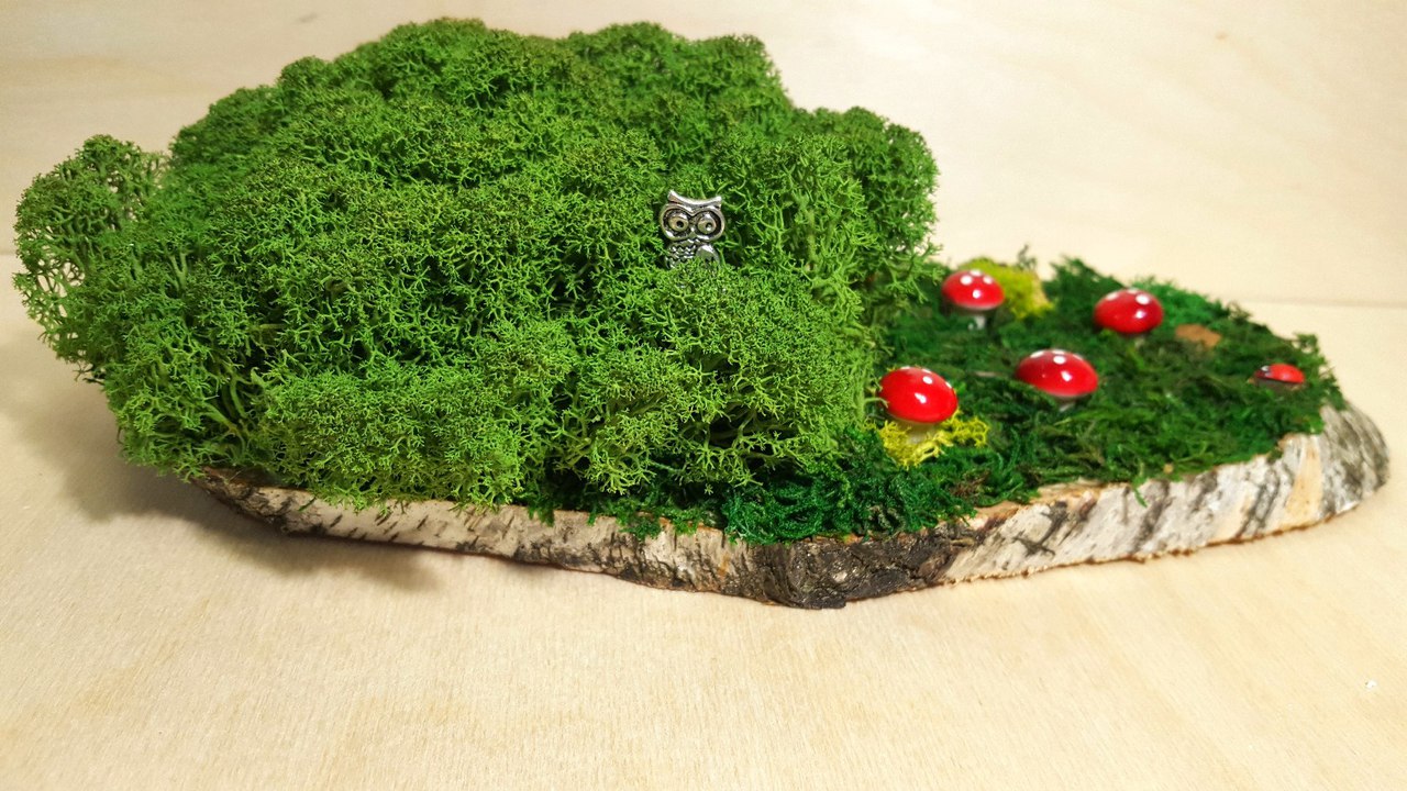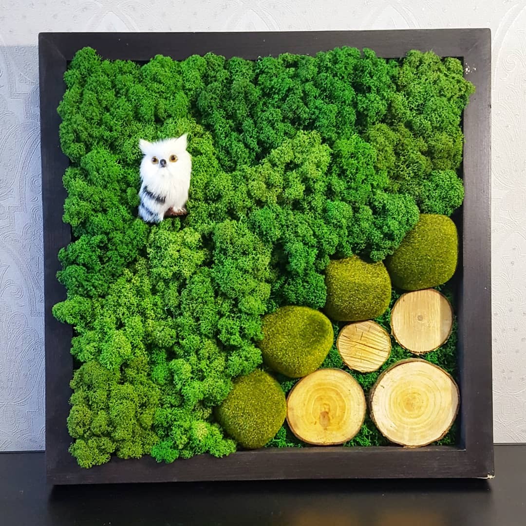 De los pedazos de musgo, puedes recoger una imagen pintoresca. La planta se puede utilizar de forma fragmentaria, convirtiéndola en la base de paisajes forestales o de aldea, o rellenarla con todo el lienzo. Va bien con otras plantas estabilizadas: flores, suculentas, helechos, así como conos y ramas coníferas.