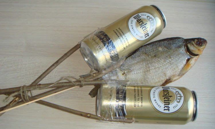 Ramos de hombres con pescado y cerveza.