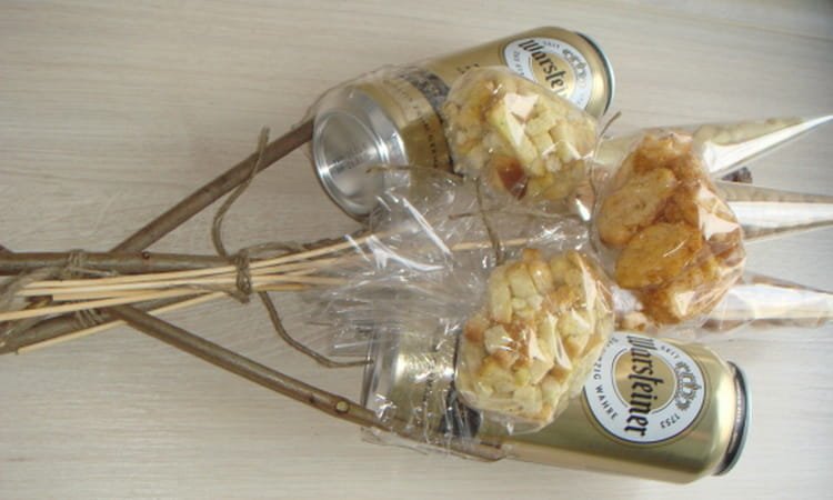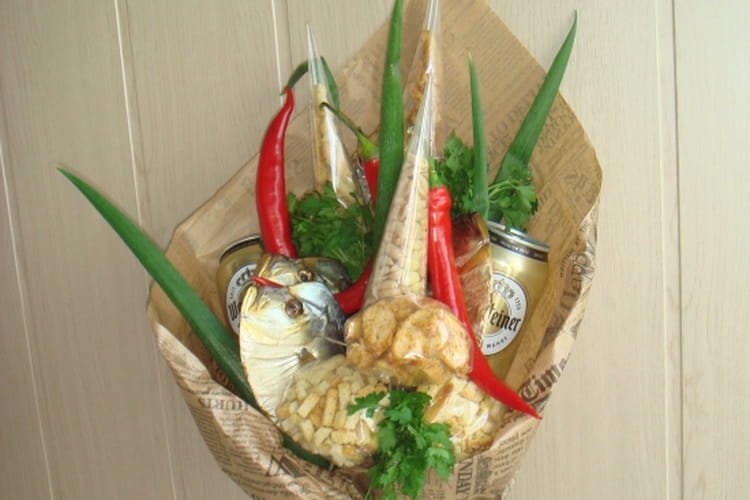 Cualquier regalo hecho por usted mismo le dará al receptor mucho más placer que un recuerdo banal comprado. En un juego para hombres, puede colocar productos cárnicos, quesos, panes, decoración de hierbas y vegetales, bebidas alcohólicas en cualquier recipiente. Los ramos de cerveza se pueden complementar con mariscos.