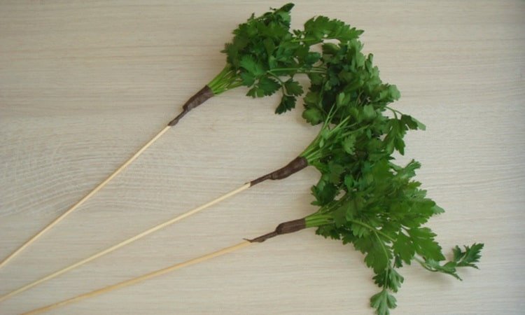 Ponemos todos los ingredientes del ramo en brochetas y los insertamos en papas crudas. Si las piezas de madera se están separando, deben sellarse con cinta adhesiva. Queda por envolver una deliciosa artesanía en papel grueso y complementarla como decoración con vainas de pimiento rojo y hierbas.