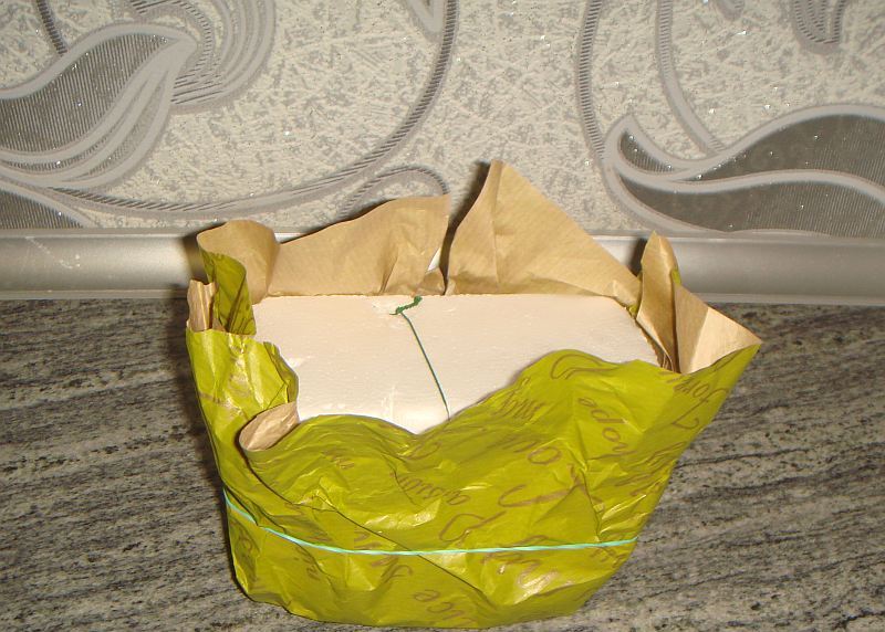 Primero debe envolver la caja con película para que el cartón no esté saturado con agua. El exterior debe estar decorado con papel de envolver, tela o cualquier material. Colocamos la esponja en el recipiente e insertamos las flores preparadas.