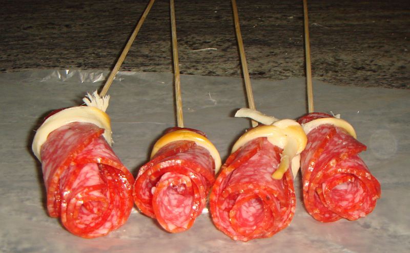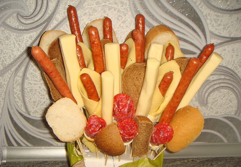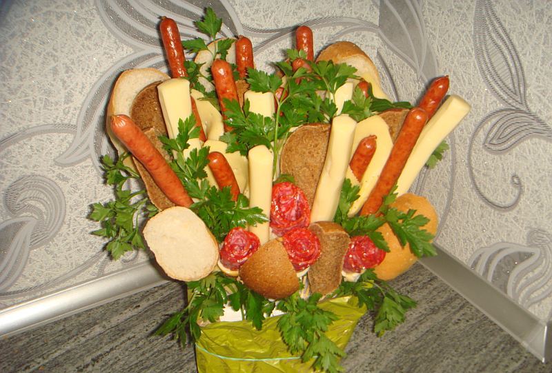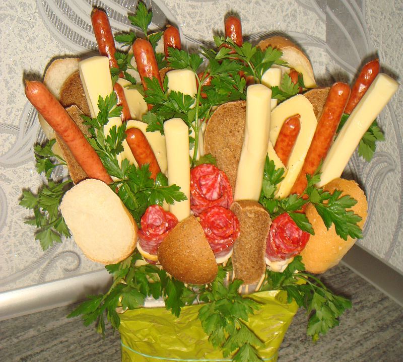 Puede empacar un regalo comestible para hombres en papel kraft, una canasta, una caja floral. Salchichas de caza, salchichas de una forma original, lonchas de jamón, queso en forma de bolas se verán muy bien en un ramo. Puede complementar la composición con hierbas, pequeños huevos de codorniz.