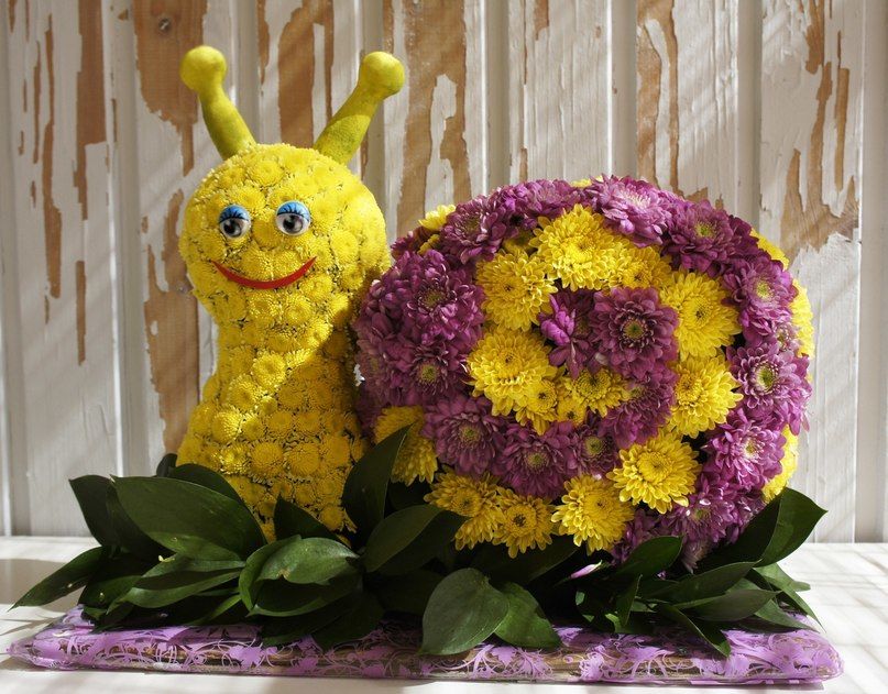 Cualquier flor fresca, incluso los brotes sin abrir, son adecuados para un ramo. Las cabezas se cortan y se insertan en la esponja de acuerdo con el plan. Los ojos, la boca y la nariz de la composición están hechos de cuentas preparadas, accesorios adicionales. Más a menudo para ramos-figuras usan crisantemos. No tienen pretensiones, las variedades y especies están representadas por una gran variedad de colores.
