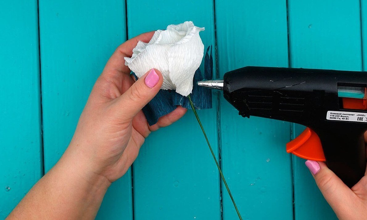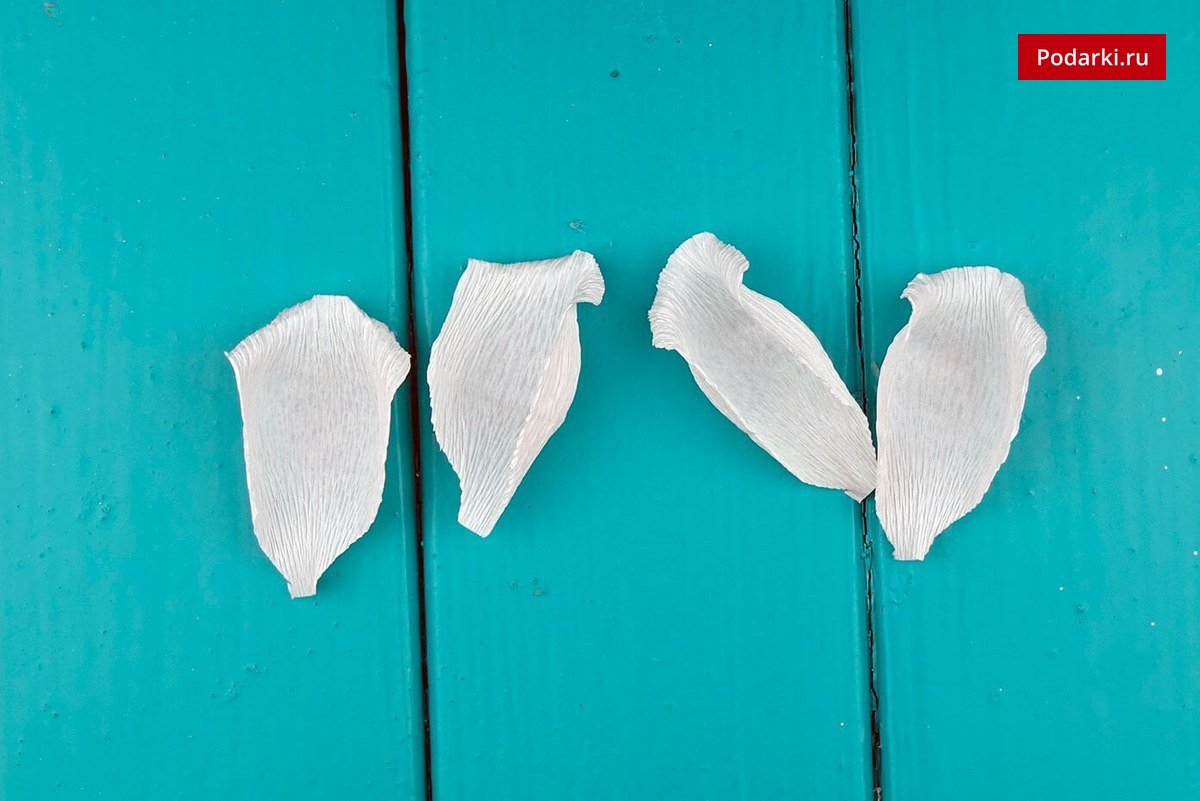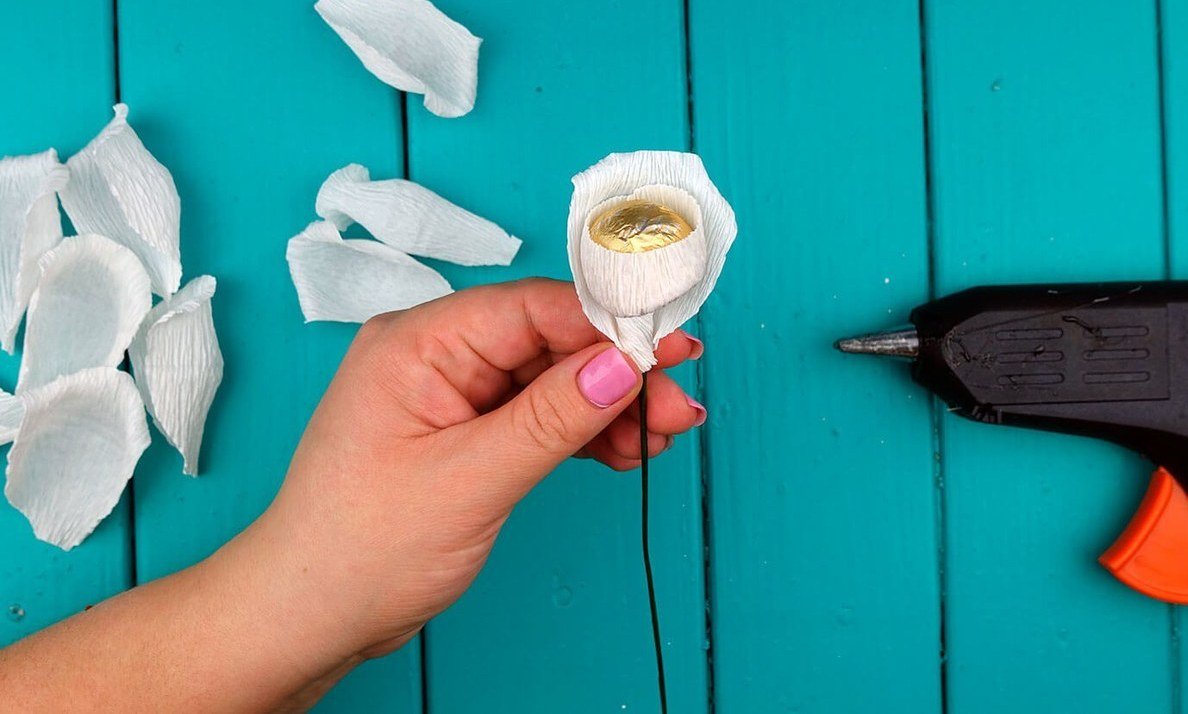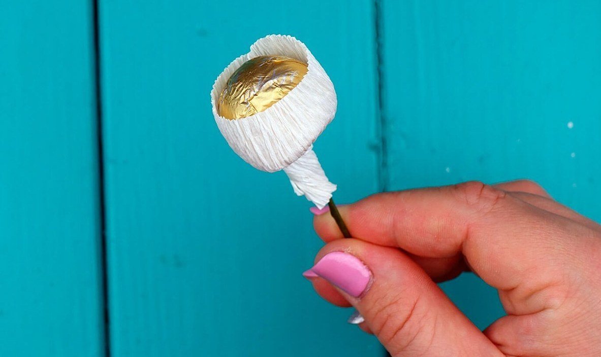 Separe el número requerido de segmentos del cable, ensarte los dulces sin perforar. Cortar la organza en cuadrados, doblar por la mitad, envolver los espacios en blanco. Ponemos todos los tallos juntos y arreglamos con cinta adhesiva. Enmascararlos con papel corrugado.