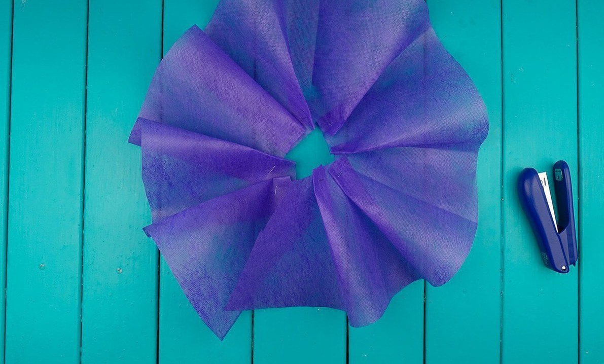 Corta un trozo de fieltro floral, coloca la botella en el centro y recoge el material con una cinta debajo del cuello.