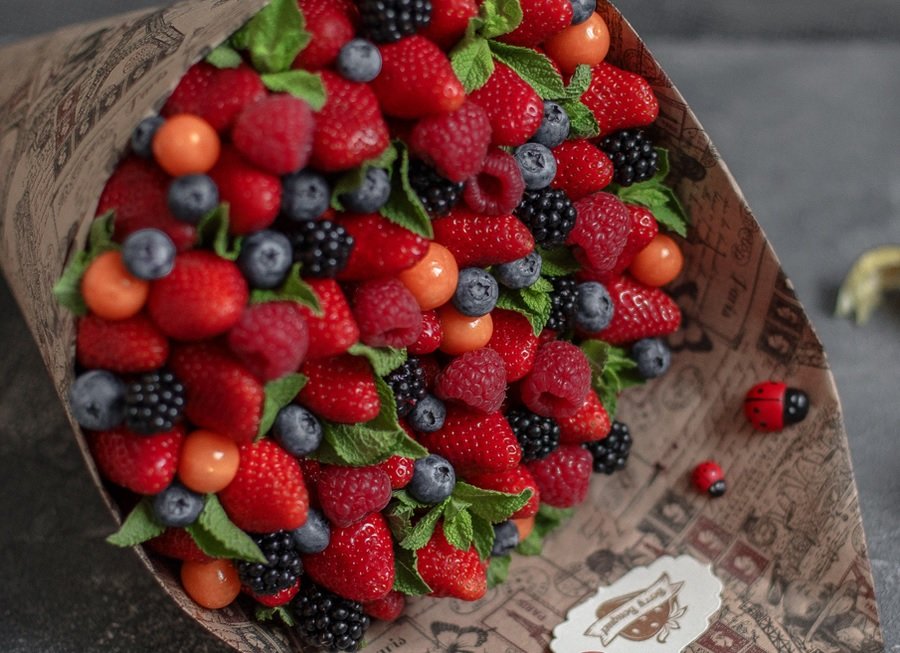 Las composiciones de frutas y bayas están ganando cada vez más popularidad. Se prefieren debido a la alta estética y practicidad.Tal ramo no se desvanecerá, después del disfrute visual se puede comer. El regalo no banal sorprenderá no solo al héroe de la ocasión, sino a todos los invitados. Puede hacerlo en función de su propia imaginación o utilizar una idea ya hecha.