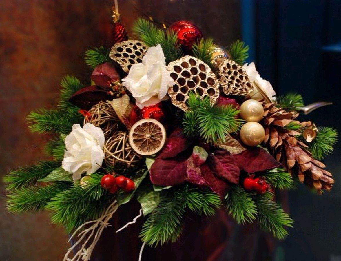 La preparación de los regalos de Año Nuevo comienza mucho antes de las vacaciones. Decorar la habitación con elementos decorativos realmente inusuales ayudará a un ramo de una variedad de detalles. Las composiciones para el año nuevo están hechas de los siguientes materiales: