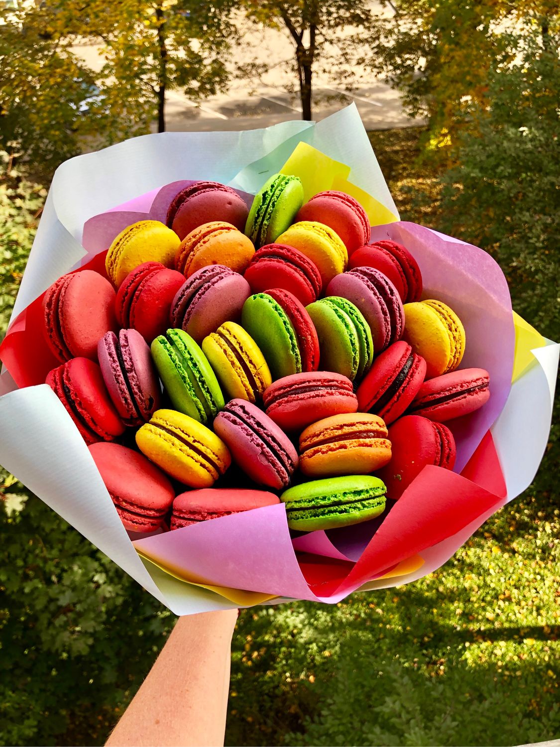 Para causar una impresión real y hacer un regalo original, puede agregar un ramo floral con macarrones. Todas las representantes femeninas estarán felices con una presentación creativa con una deliciosa adición.