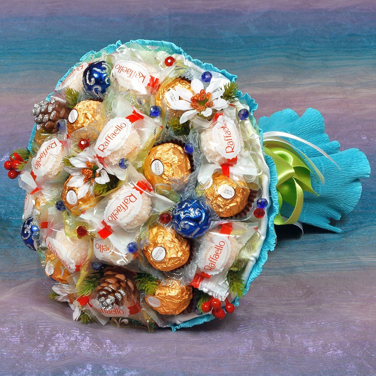 Componentes artificiales Utilizan decoraciones navideñas, jabón hecho a mano, artesanías de papel y otros detalles como decoración. A menudo, tales ramos se hacen para un niño en el jardín de infantes o en la escuela primaria;