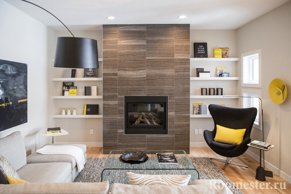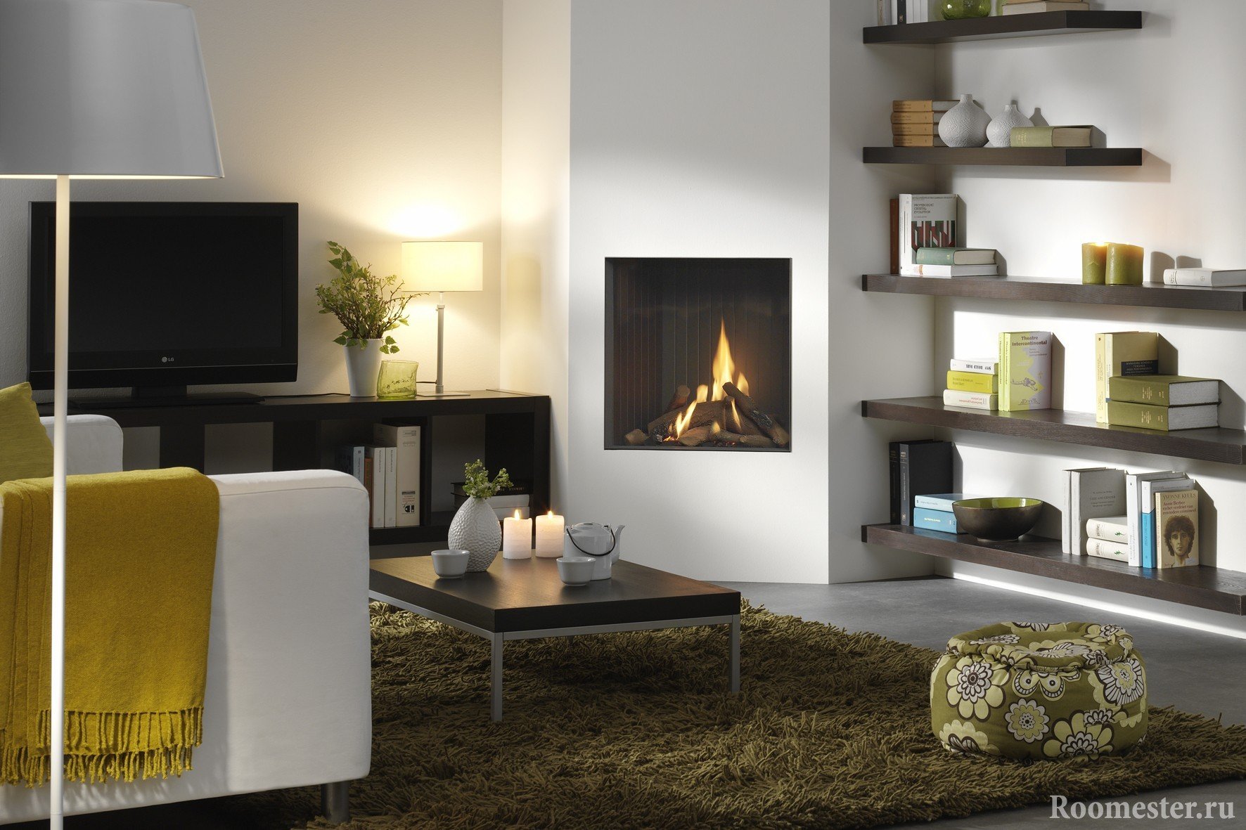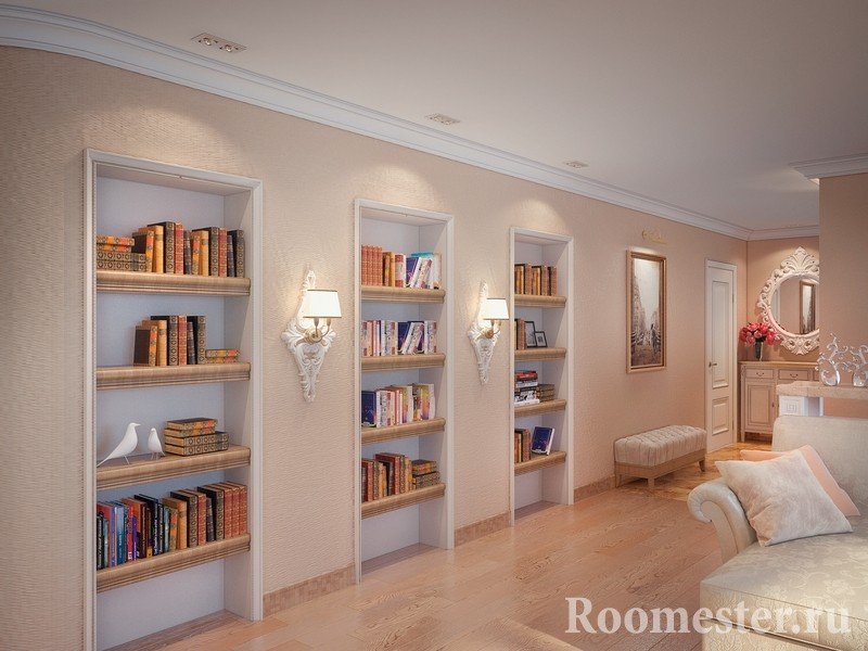 Los estantes incorporados a menudo están hechos de paneles de yeso. Parecen una parte de la pared y encajan armoniosamente en el diseño de la habitación.