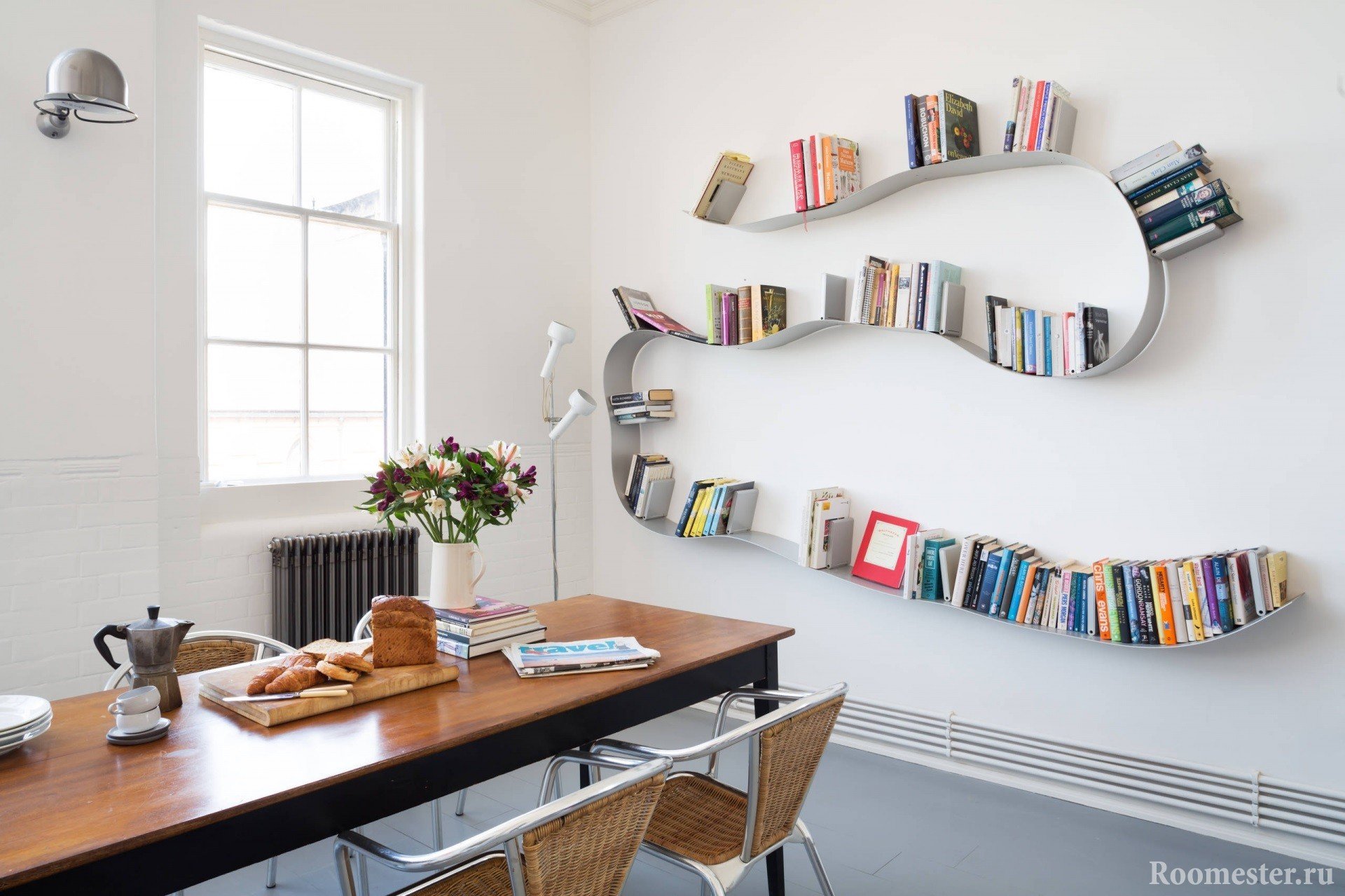 Los estantes de pared en el interior se pueden organizar de diferentes maneras, desarrollar un diseño de forma independiente o dibujar estantes en la pared en formas originales: