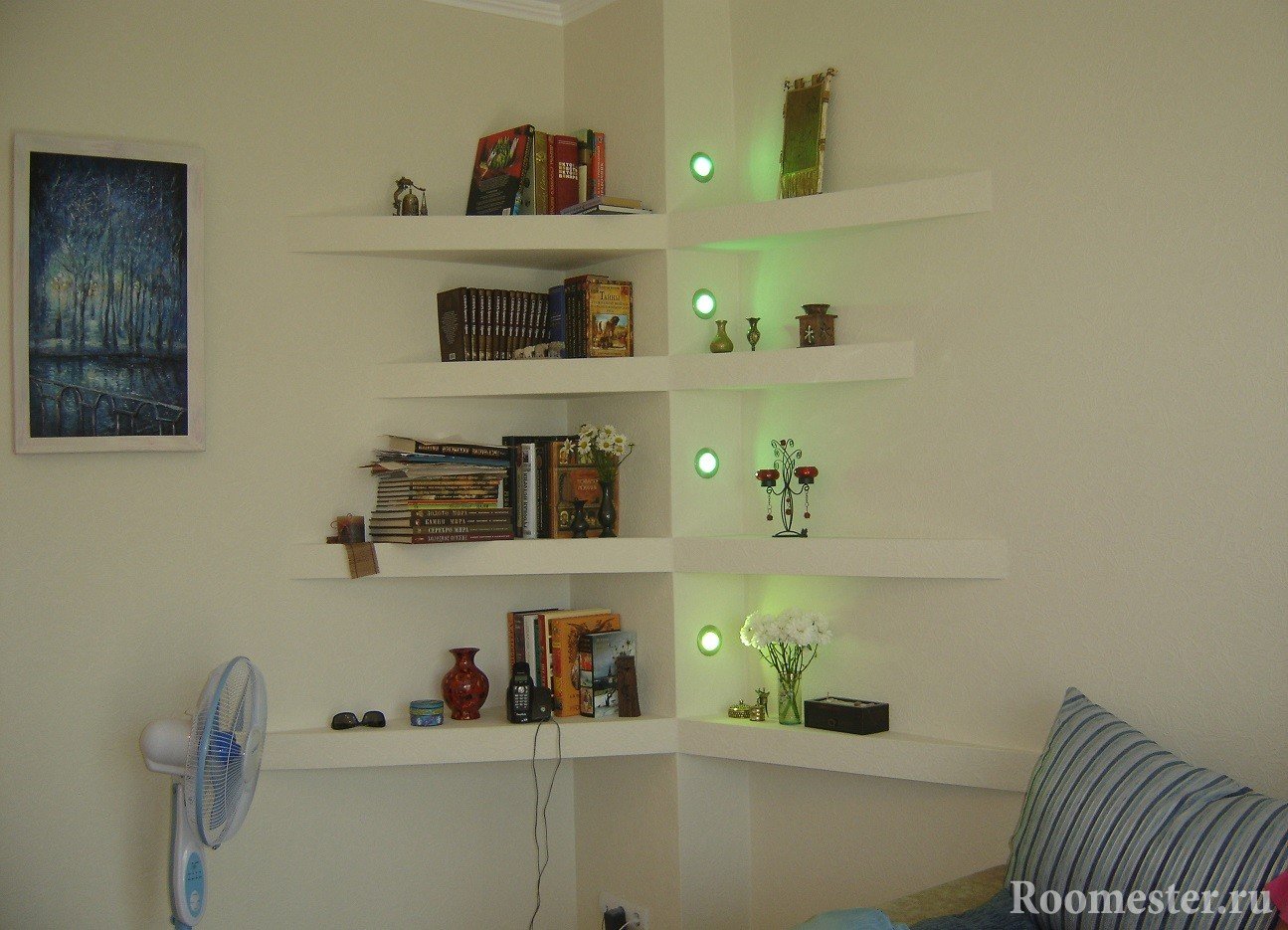 Los últimos tres tipos no se usan muy a menudo, pero son muy originales, inusuales. Desde paneles de yeso, puede hacerlo usted mismo pensando en el diseño. Si te enfocas en el diseño, entonces los estantes son: