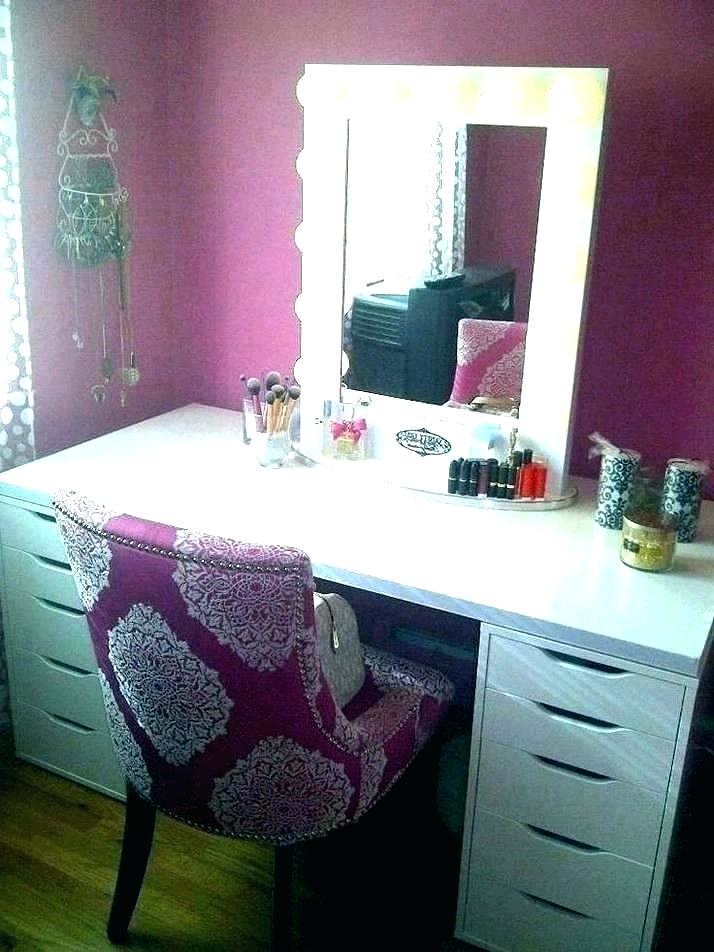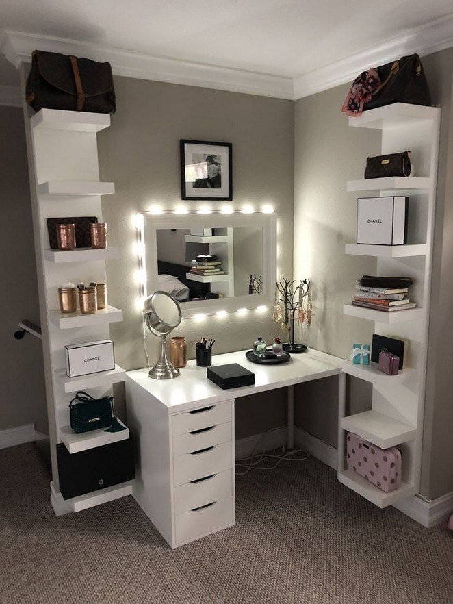 En el dormitorio Para el dormitorio, un tocador es adecuado. Puede ser angular o de pared. La altura de la encimera es en promedio de 75 cm, pero al elegirla es necesario centrarse en la altura de la mujer. Ancho: 40-45 cm. La superficie del espejo debe ubicarse en el centro de los ojos en posición sentada.