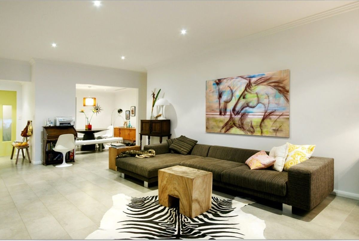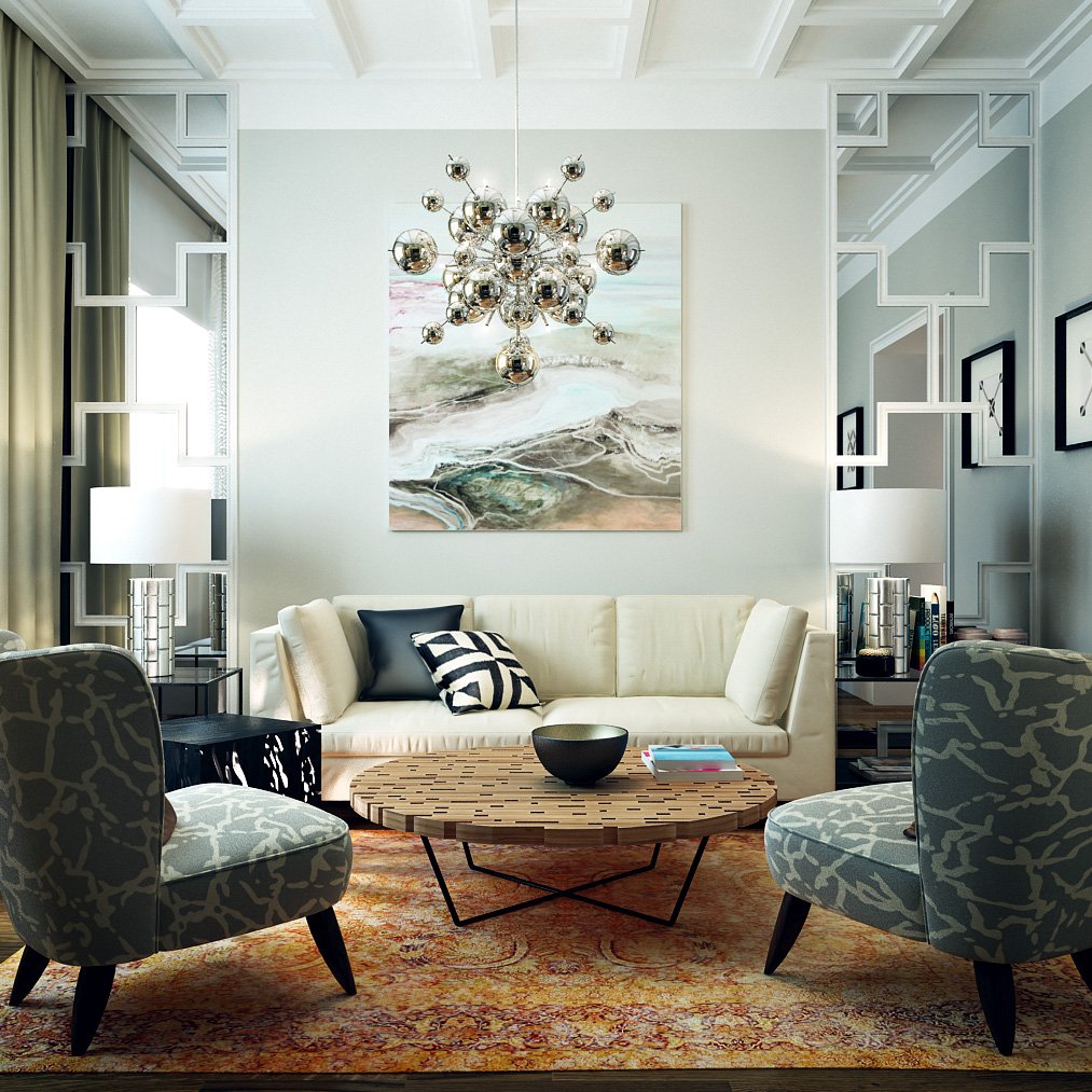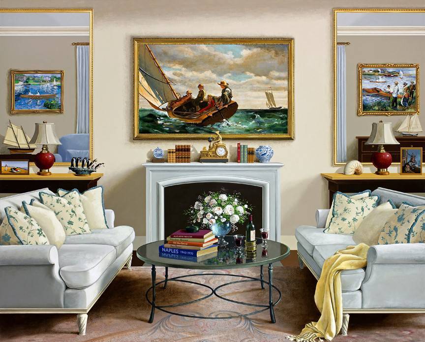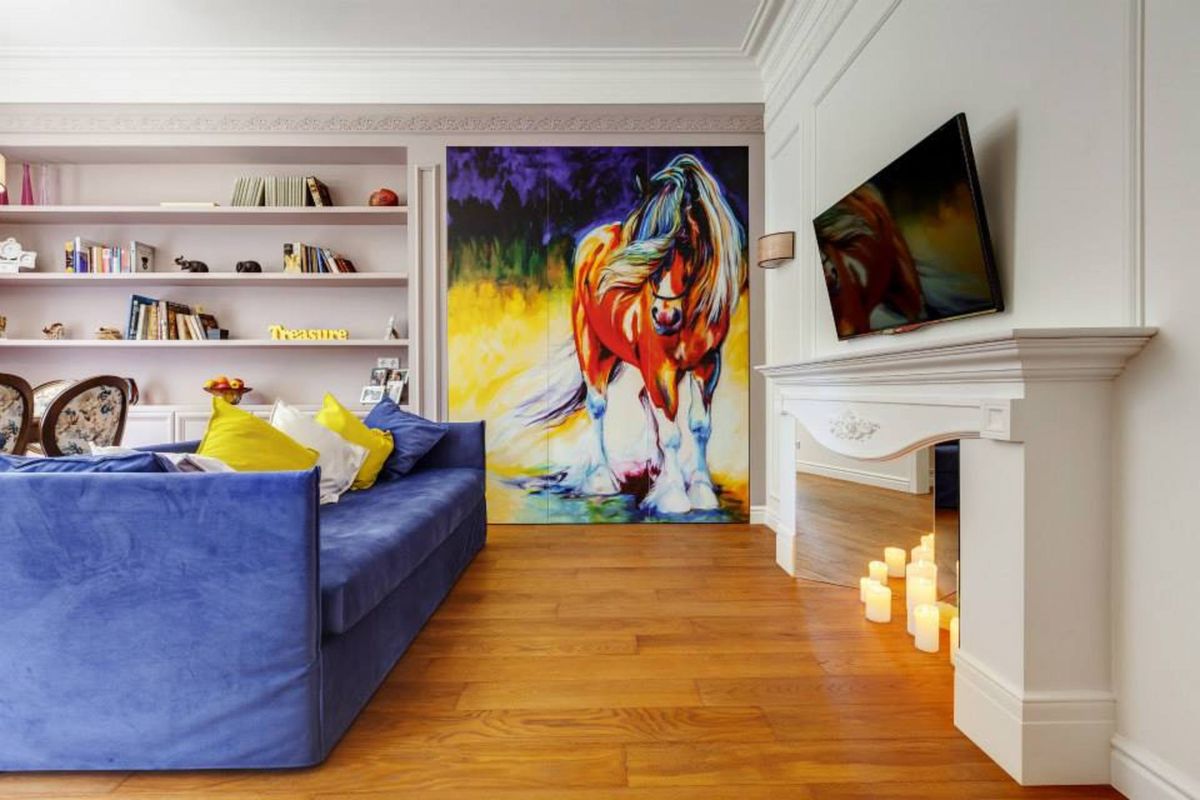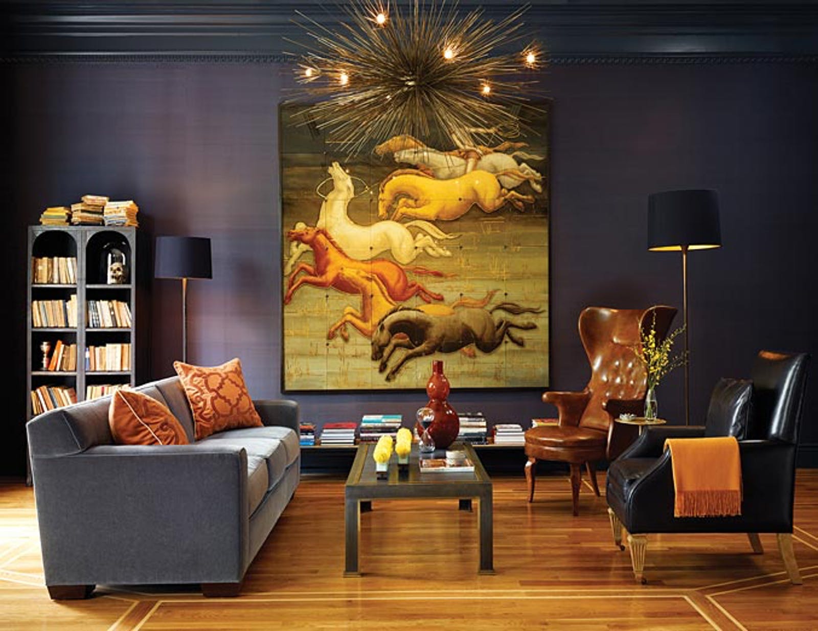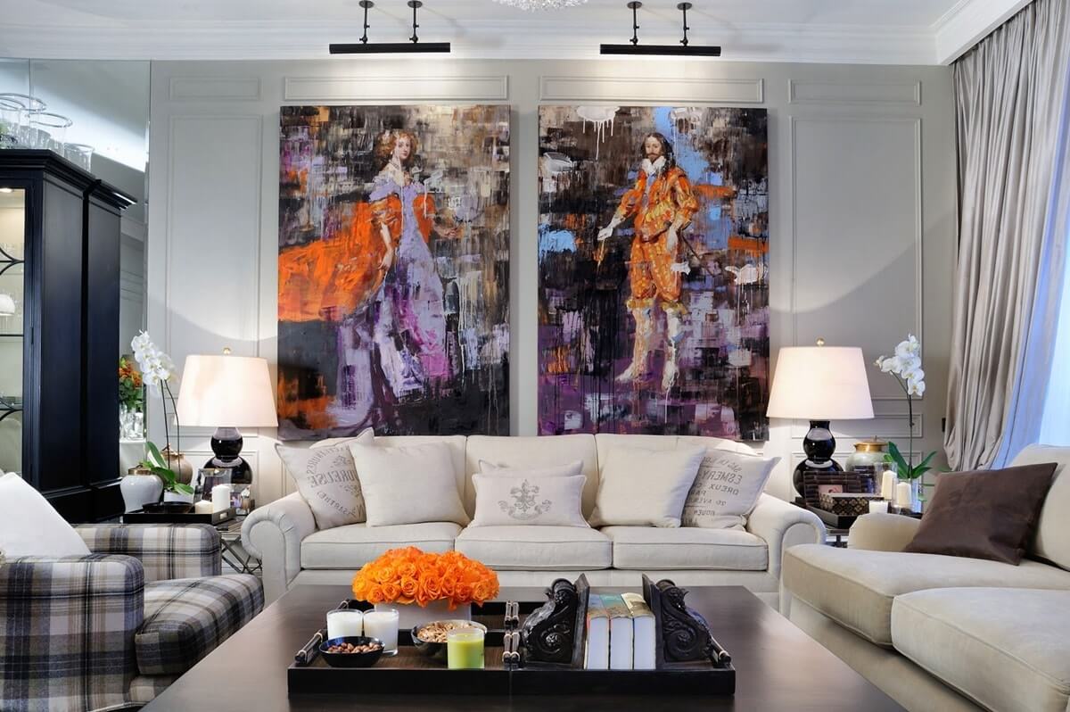 Grandes pinturas están colgadas en la sala de estar, con un montón de detalles, una variedad de colores, de modo que los invitados en casa, los propietarios estarían interesados en considerarlos durante mucho tiempo. Dependiendo del estilo de la habitación, las pinturas de I. Bosch, P. Bruegel, S. Botticelli, M. Chagall y otras son adecuadas.