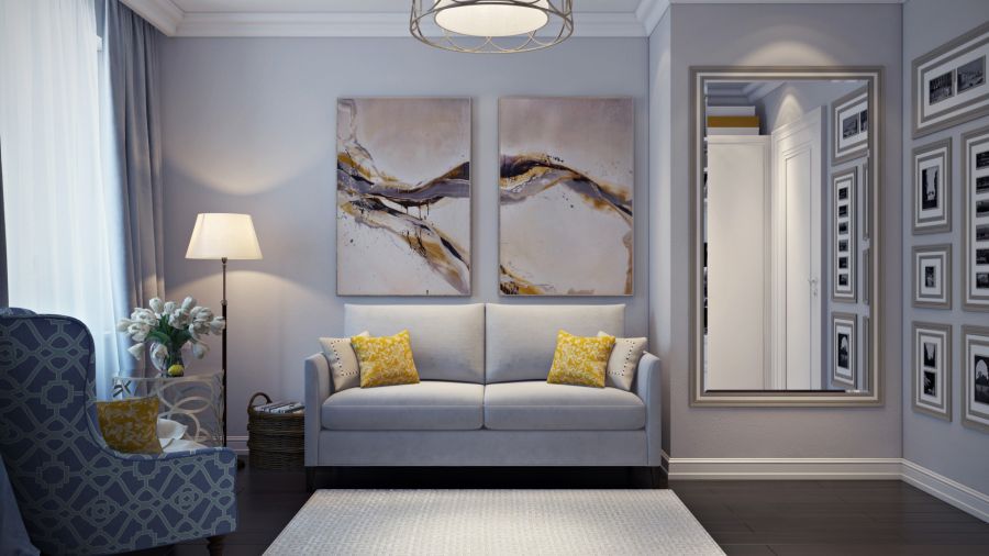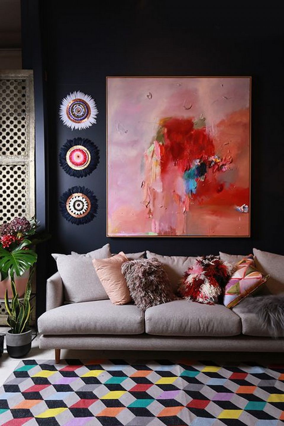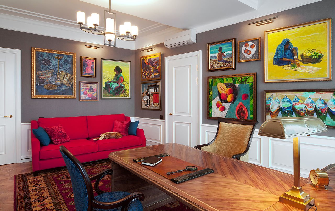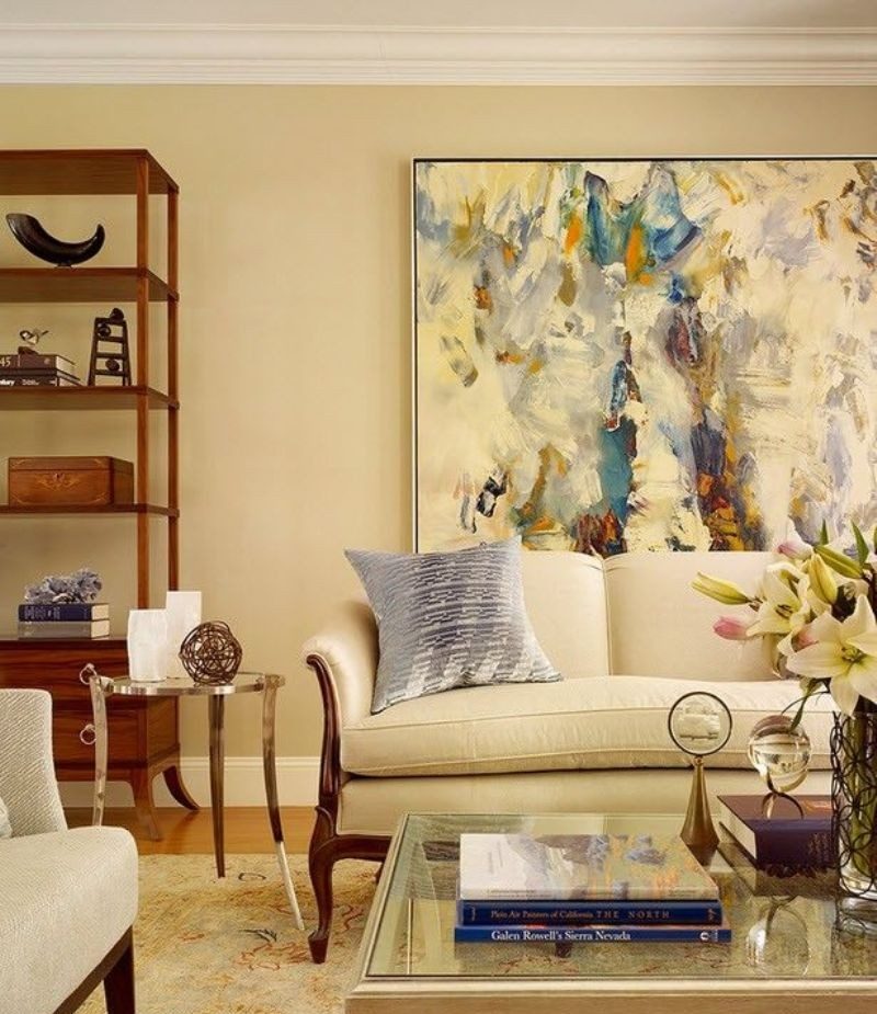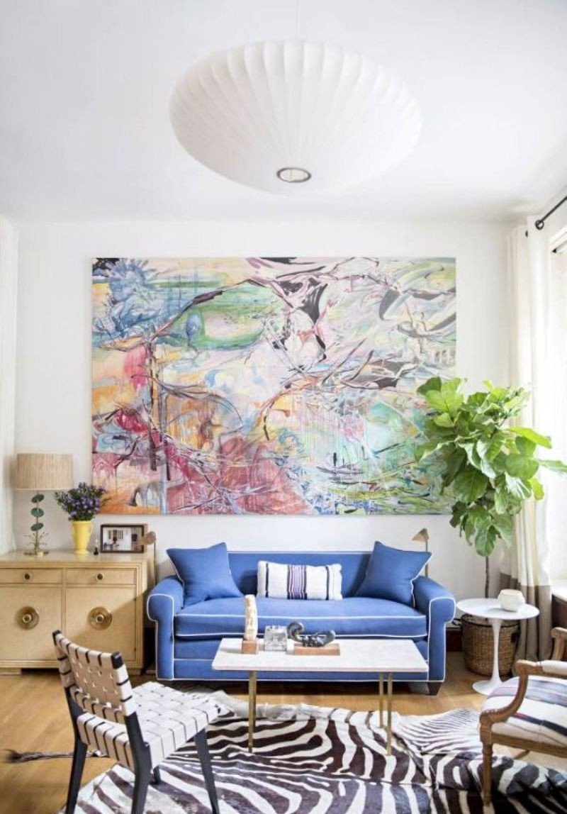 Por lo general, las pinturas se cuelgan a la altura de los ojos: grandes: a la misma distancia de los muebles más cercanos, las pequeñas se pueden organizar al azar si están todas en la misma pared o a la misma altura cuando se colocan en dos o más paredes. El único se coloca en un lugar destacado, pero si el espacio lo permite, no se deja solo.