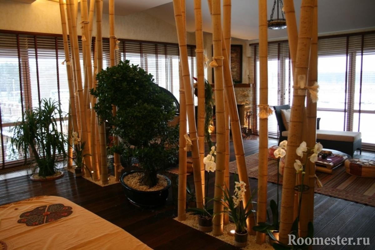 Los materiales exóticos comunes que se utilizan para decorar el interior de las instalaciones incluyen troncos decorativos de bambú. Se utilizan para crear particiones que dividen la habitación en zonas y le dan un estilo tropical.