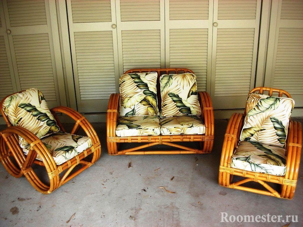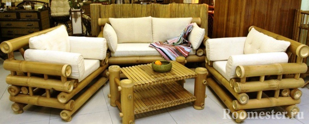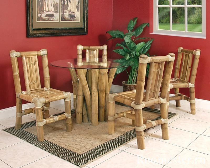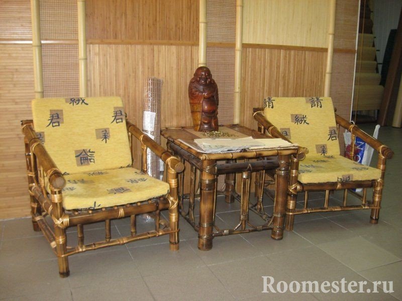 Al comprar muebles hechos de bambú, debe prestar atención al hecho de que era un material natural y no una imitación de plástico. Los tallos de los que están hechos los muebles no deben tener defectos ni grietas. Las sillas y mesas están hechas de bambú de varios diseños de complejidad, que se utilizan tanto en el interior de la casa (en el pasillo, dormitorio, sala de estar, baño, cocina, estudio) como en terrazas y cenadores en un área suburbana.La increíble ligereza de este material no causa problemas innecesarios durante el transporte.