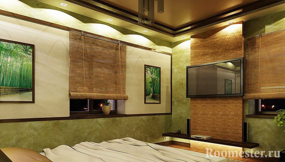 El techo hecho de tela de bambú enrollada o placas prensadas se ve extravagante en combinación con techos tensados. El lienzo de bambú complementará el exótico estilo chino en el dormitorio o el comedor.