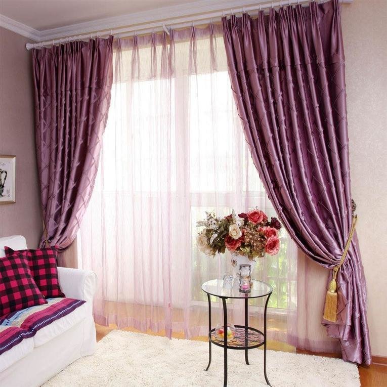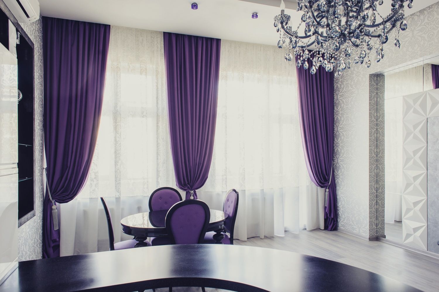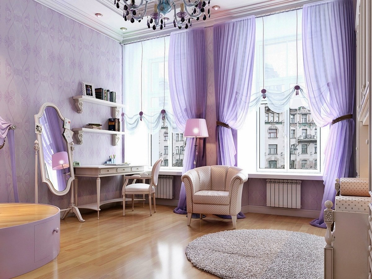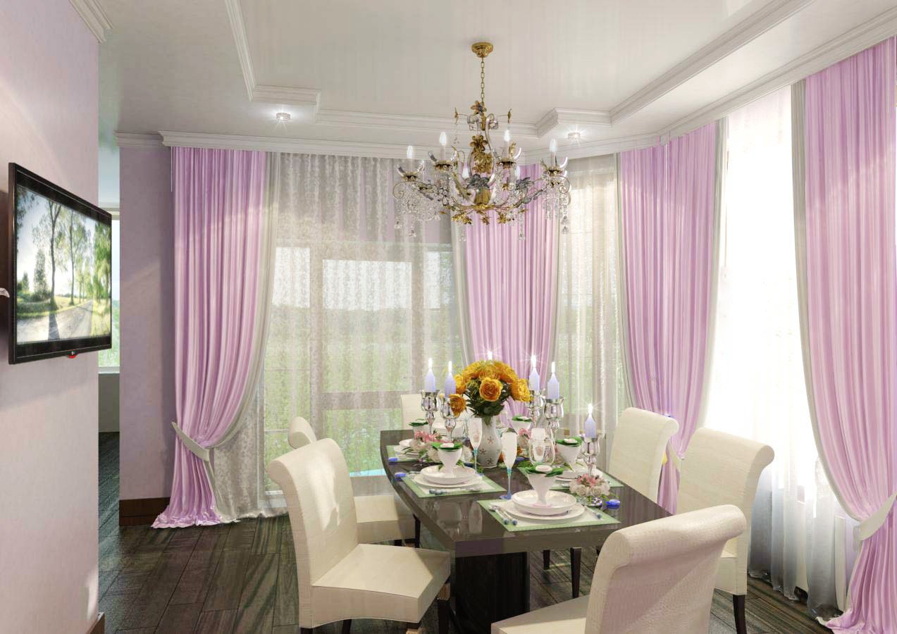Los textiles pueden ser oscuros o claros, todo depende del tono básico de la habitación. Las cortinas de color lila se pueden complementar con un tul transparente e ingrávido de un tono blanco o de leche. Pero las cortinas que son demasiado oscuras en púrpura deben evitarse. Crearán una sensación de pesadez.