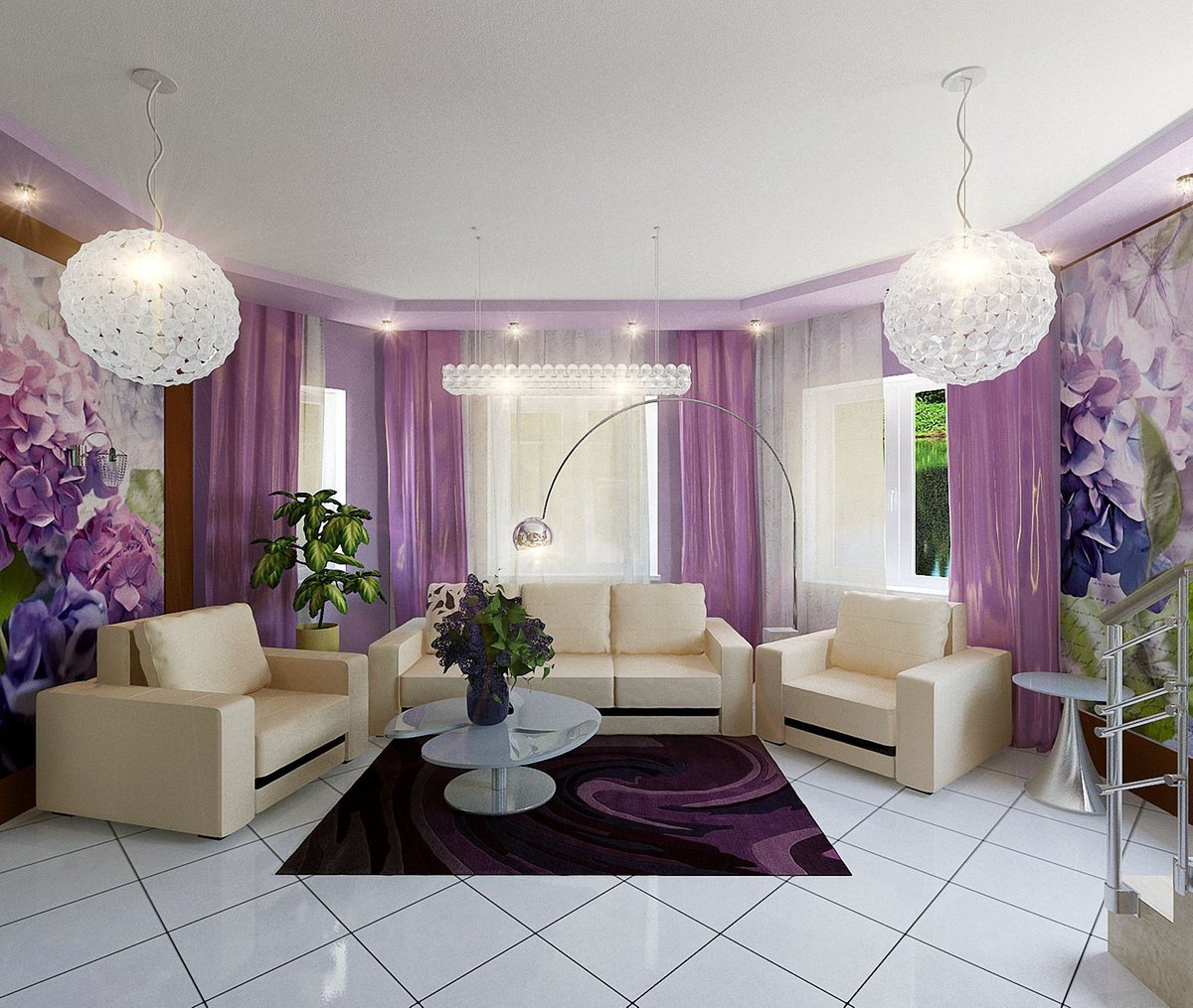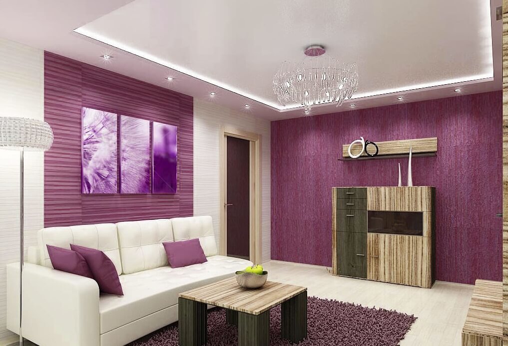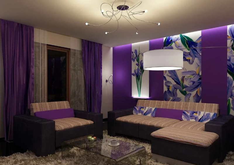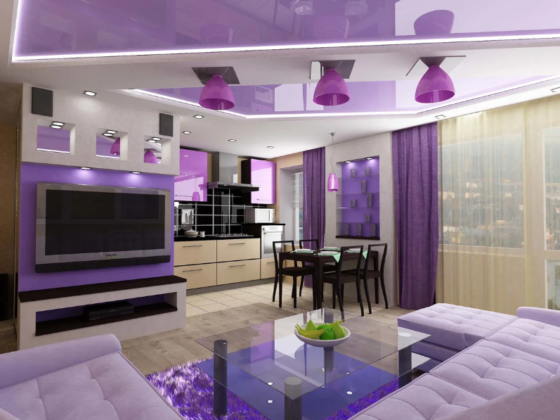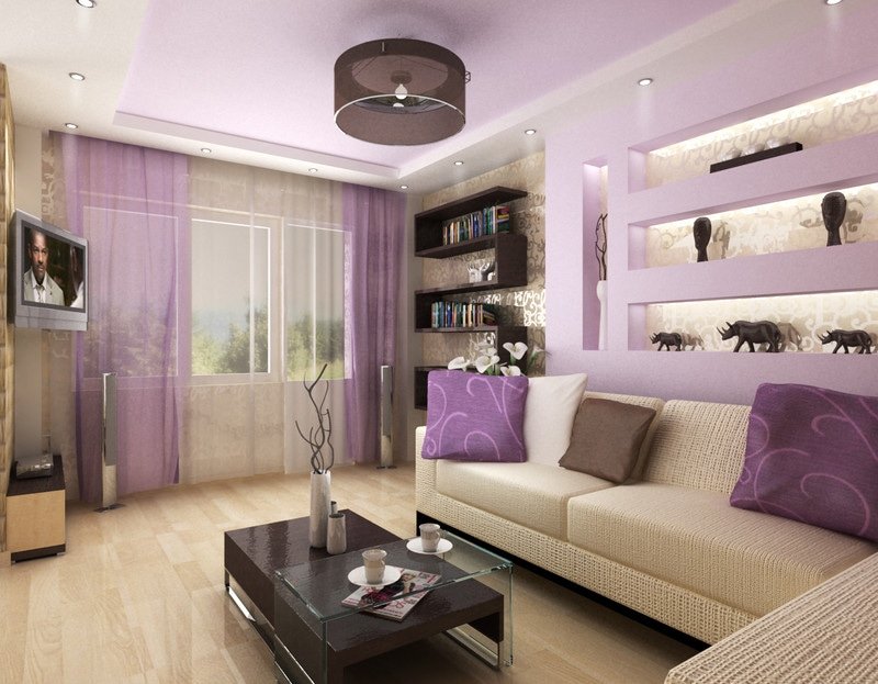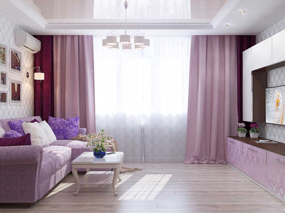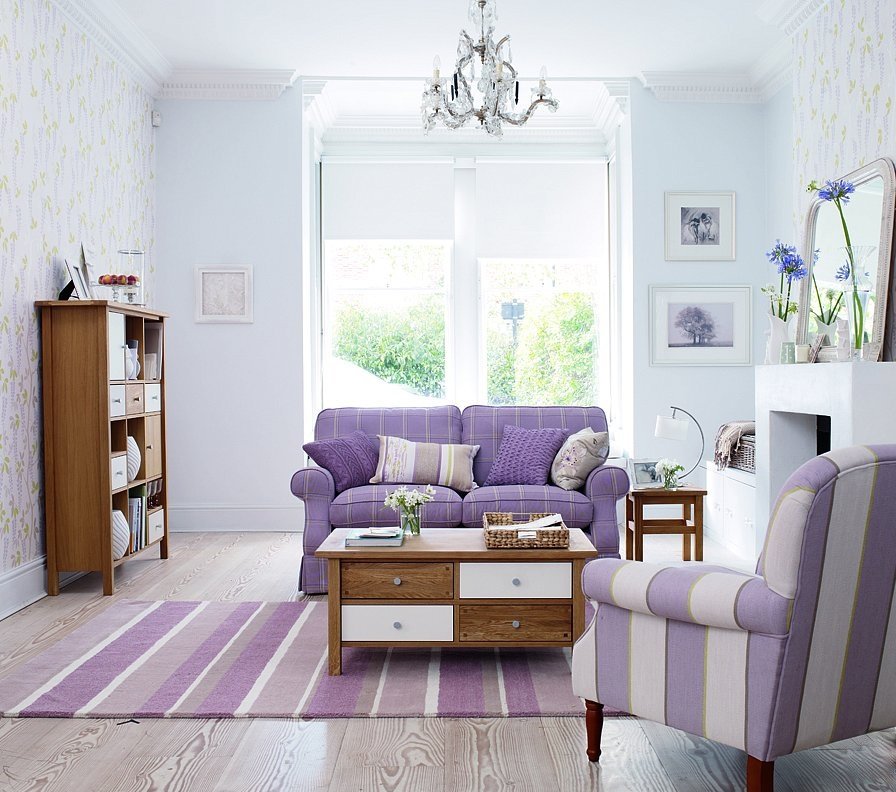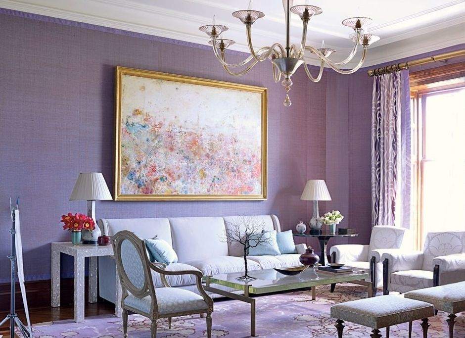 Apto para salones pequeños. Los tonos lilas de saturación ligera y media no reducen visualmente el espacio, por lo que pueden usarse en habitaciones pequeñas.