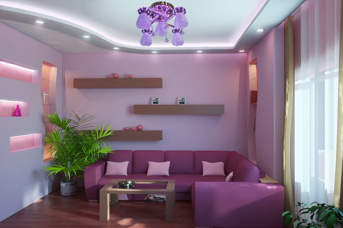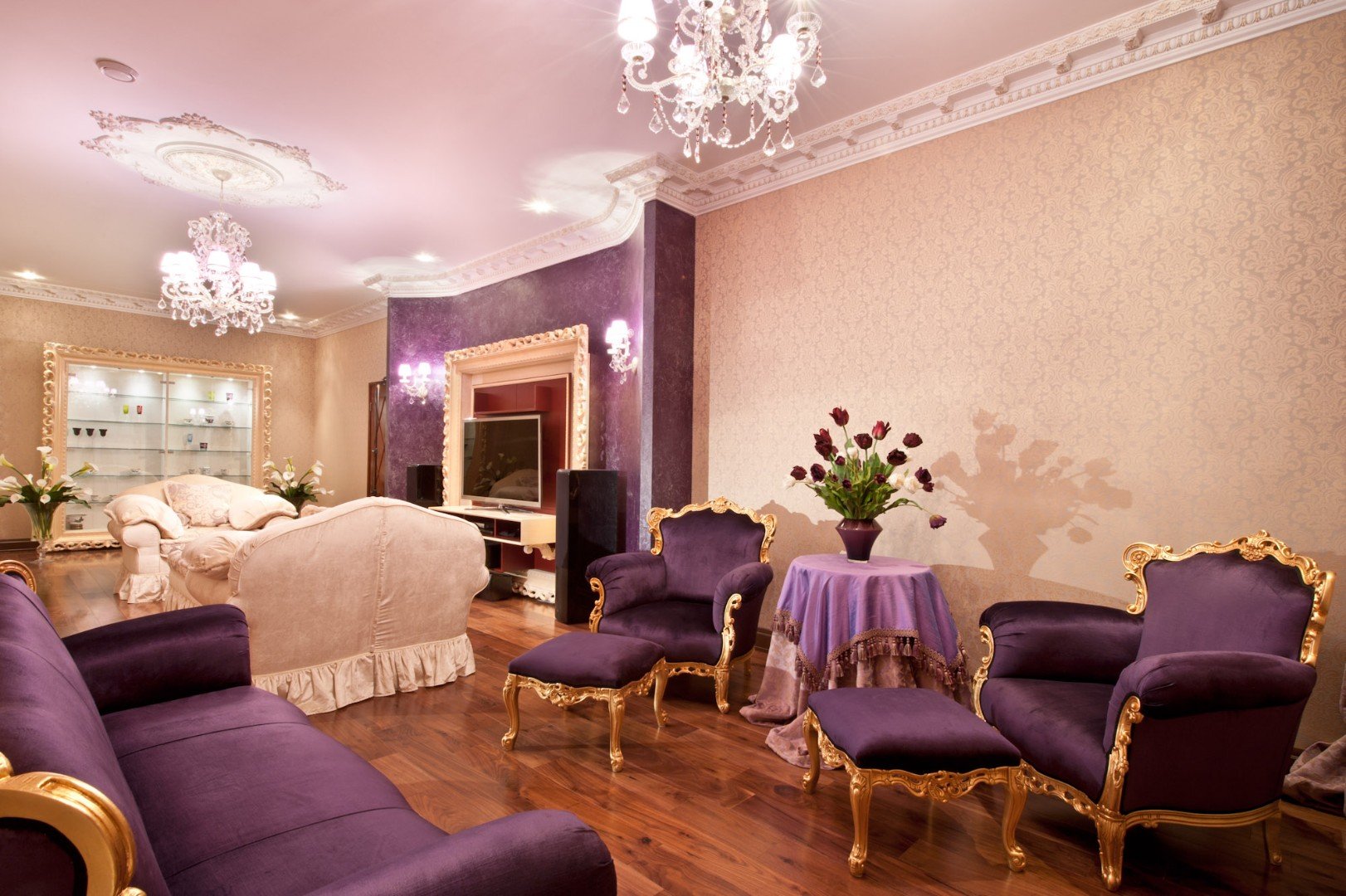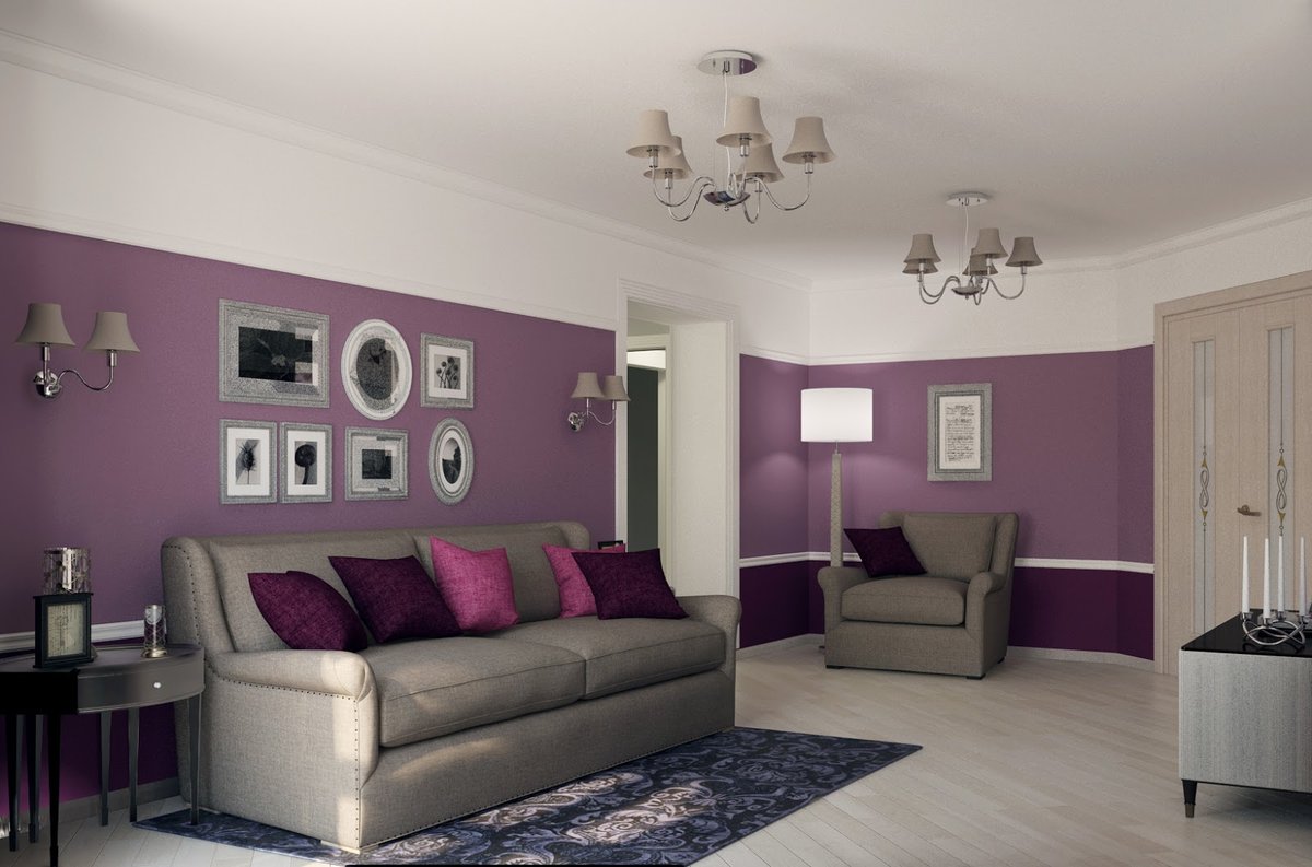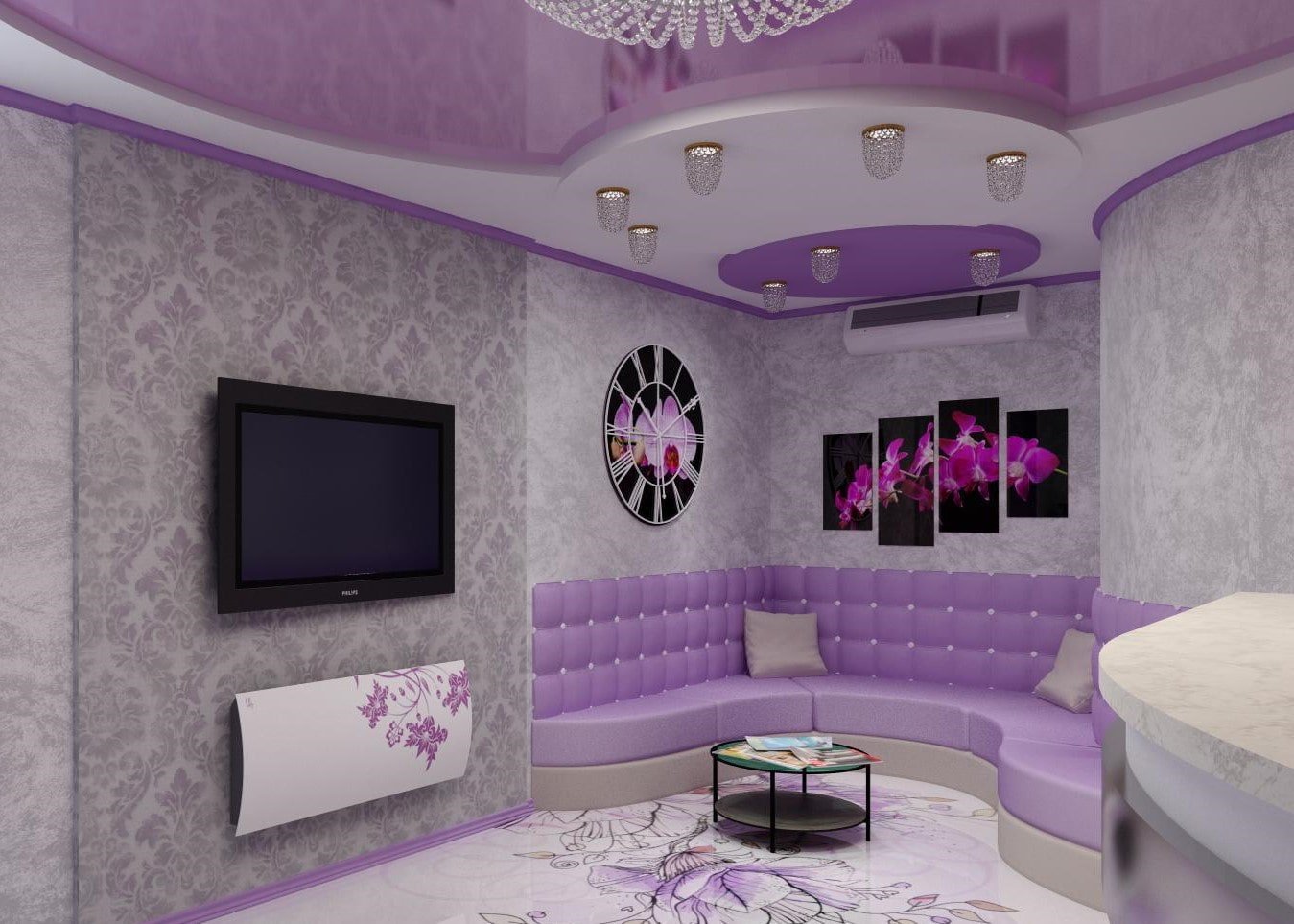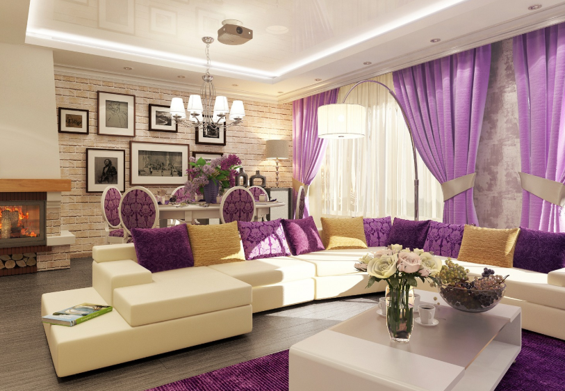Apto para salones pequeños. Los tonos lilas de saturación ligera y media no reducen visualmente el espacio, por lo que pueden usarse en habitaciones pequeñas.