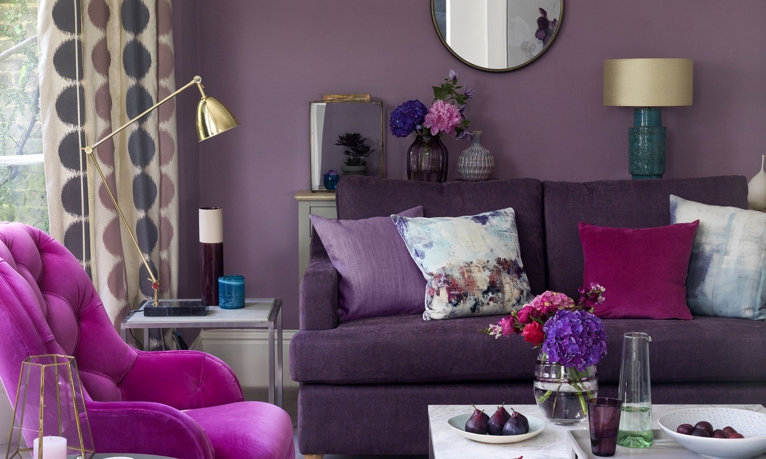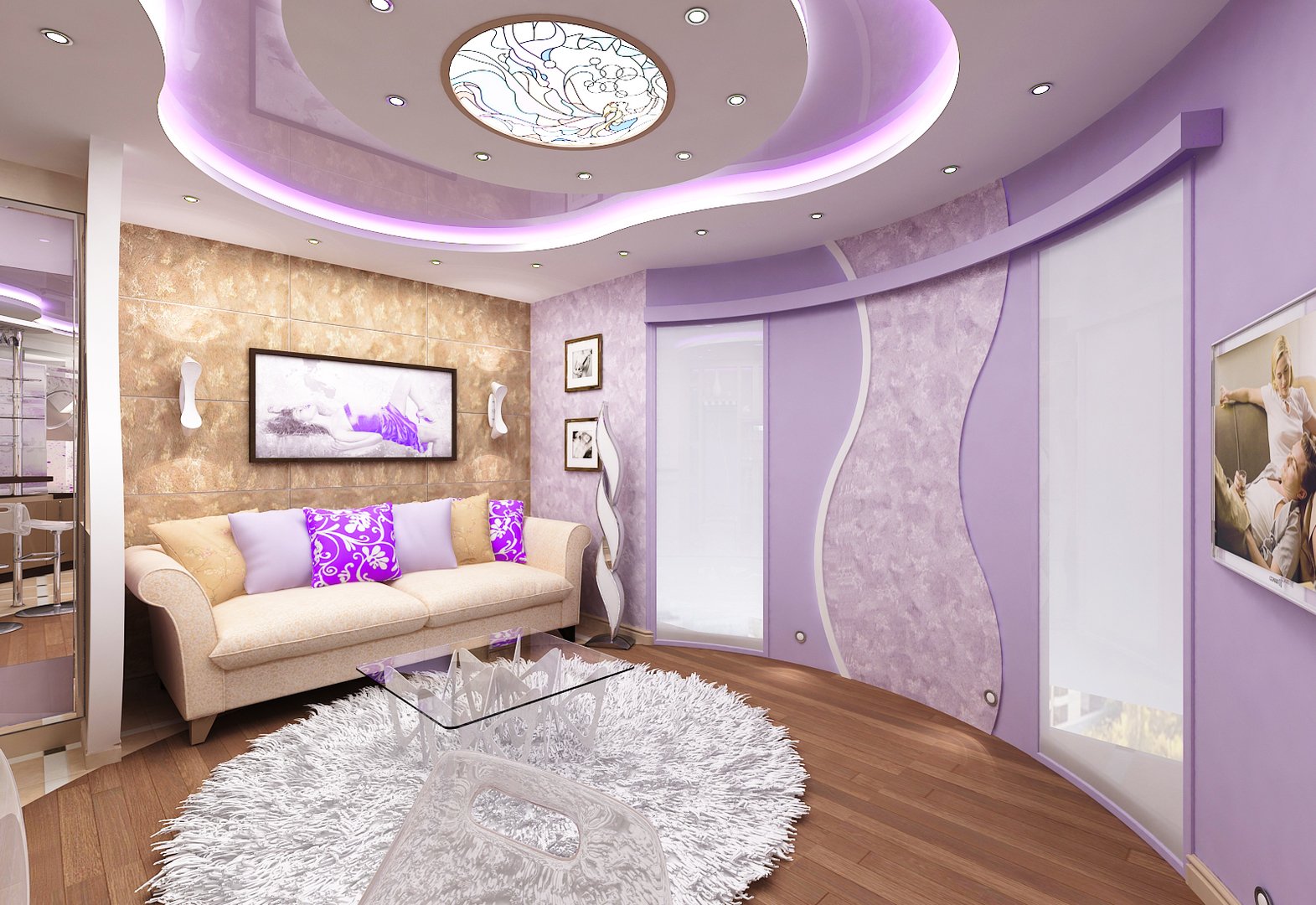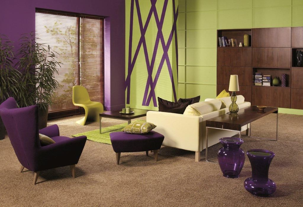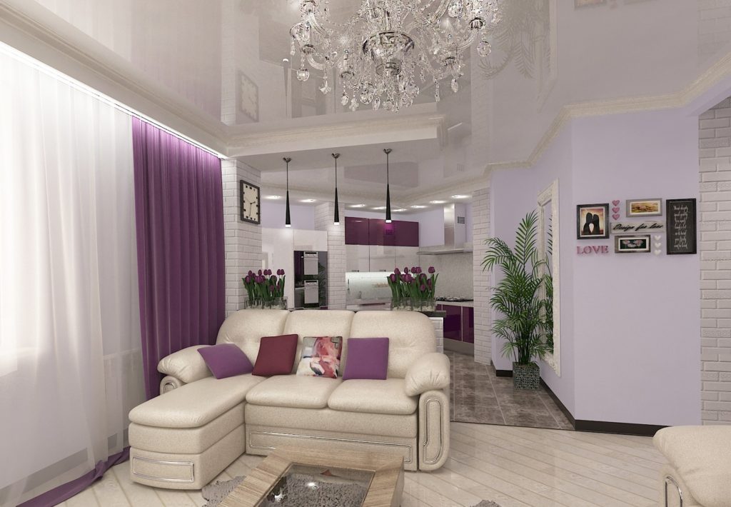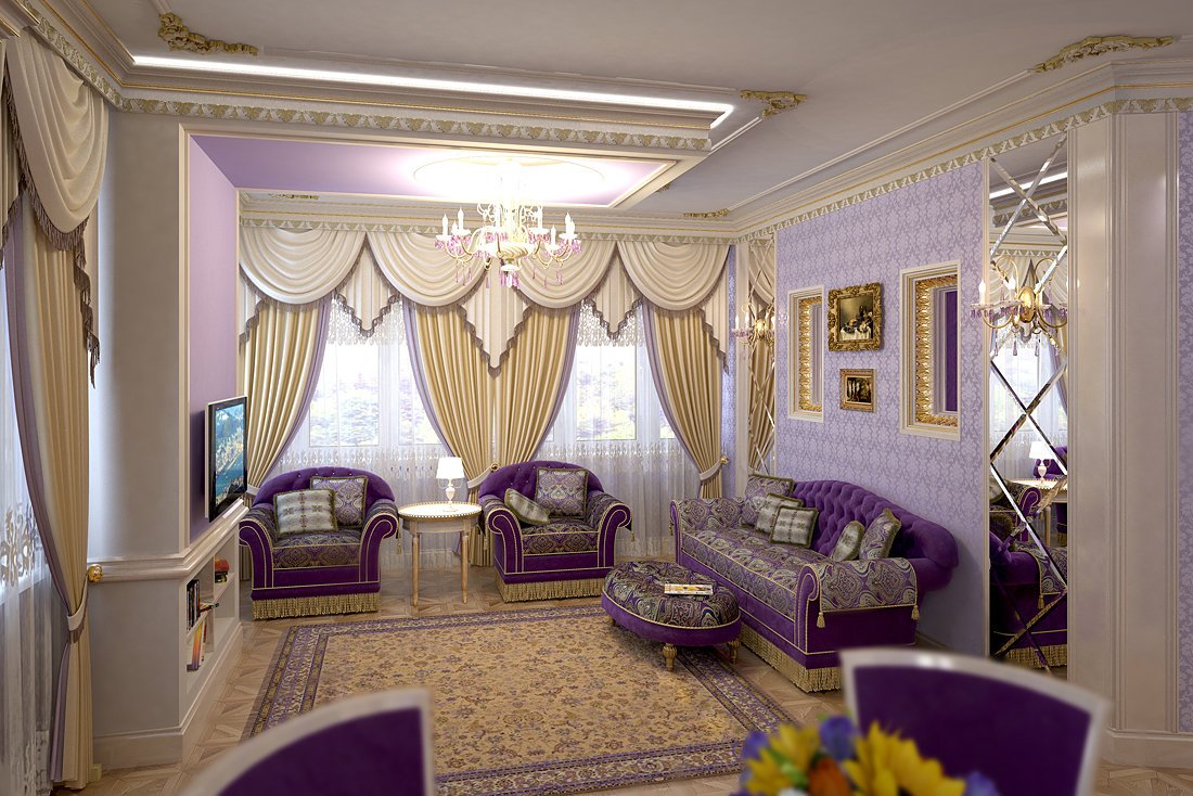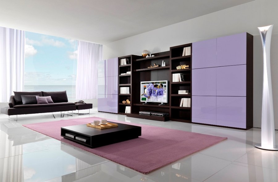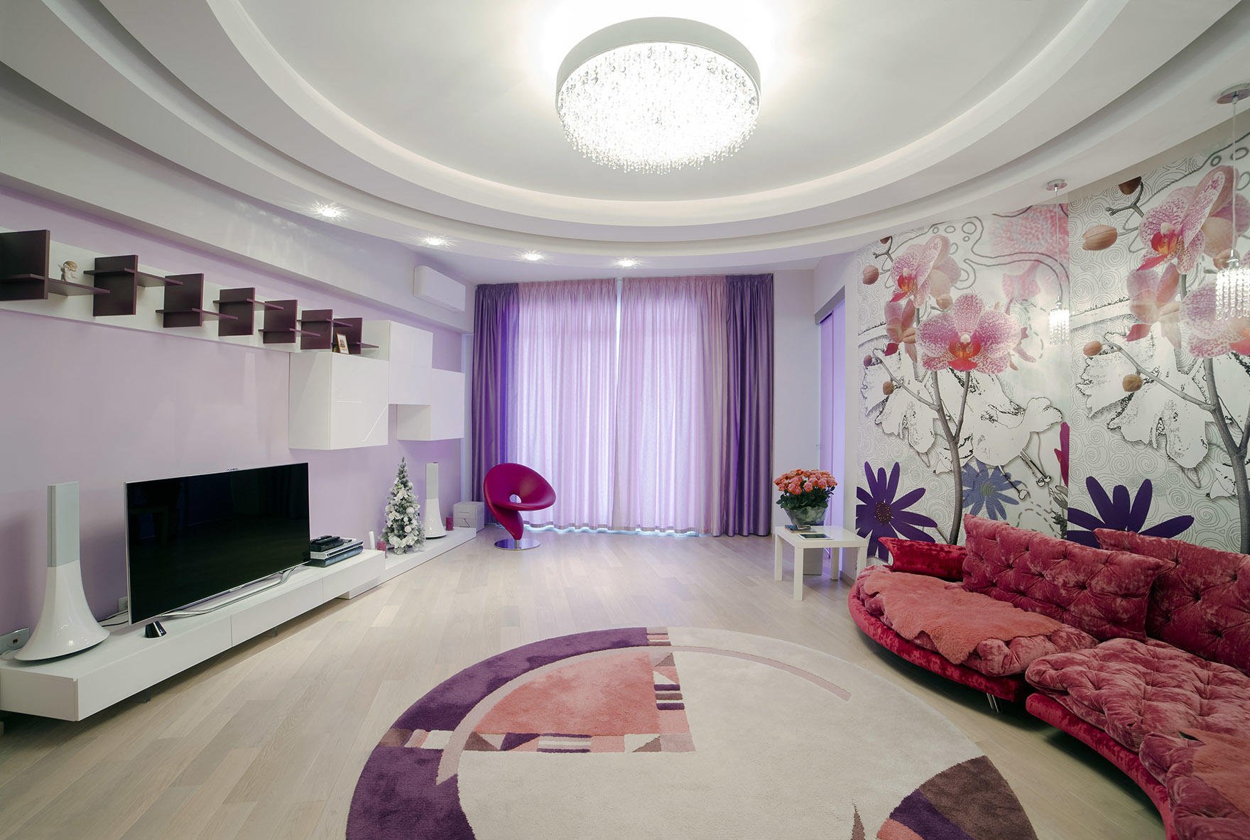 Apto para salones pequeños. Los tonos lilas de saturación ligera y media no reducen visualmente el espacio, por lo que pueden usarse en habitaciones pequeñas.