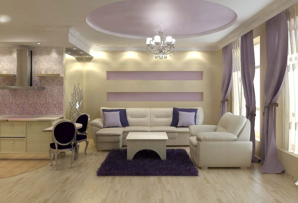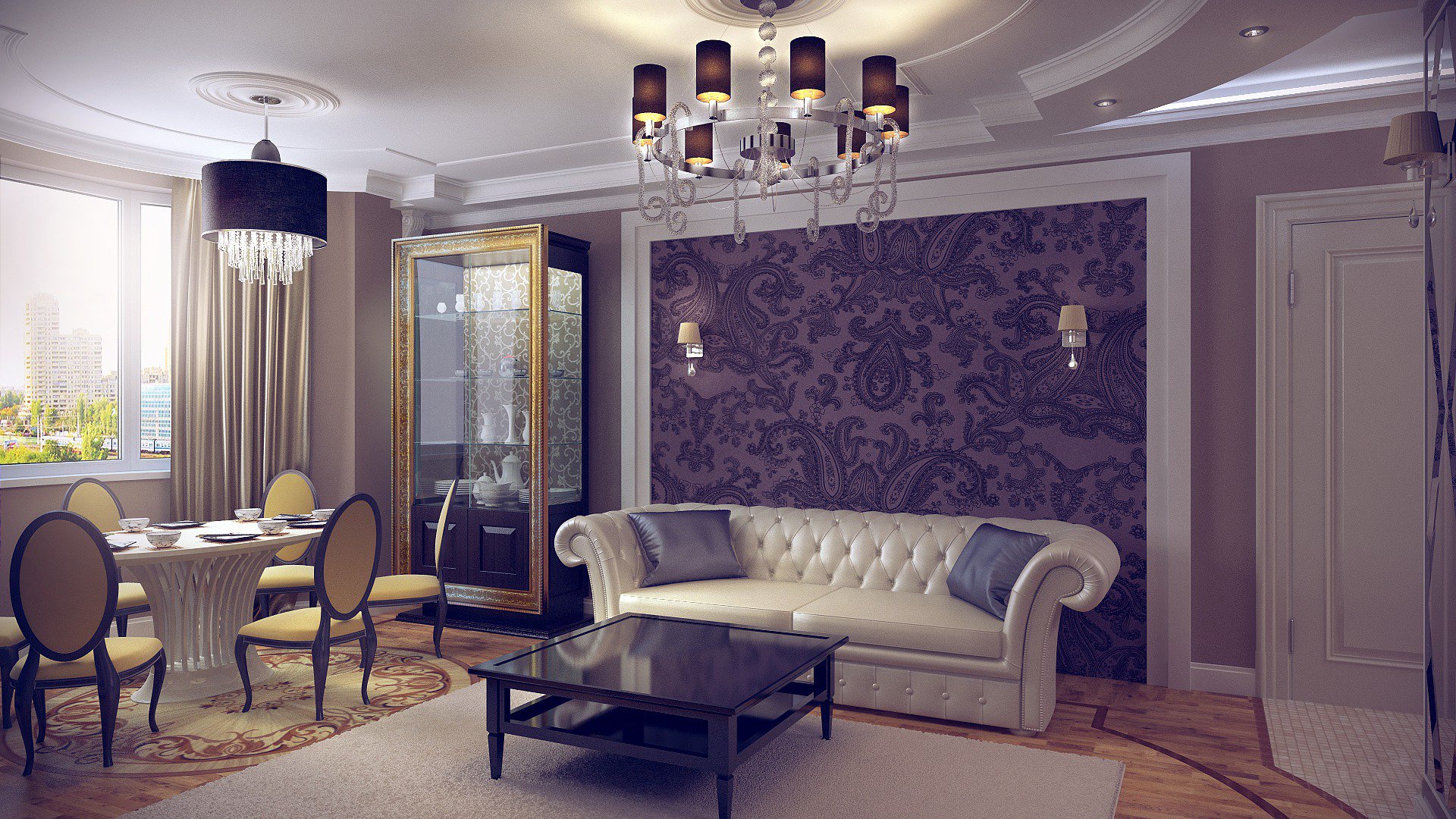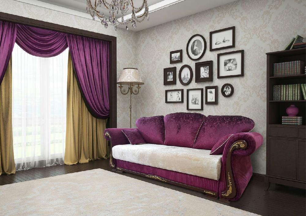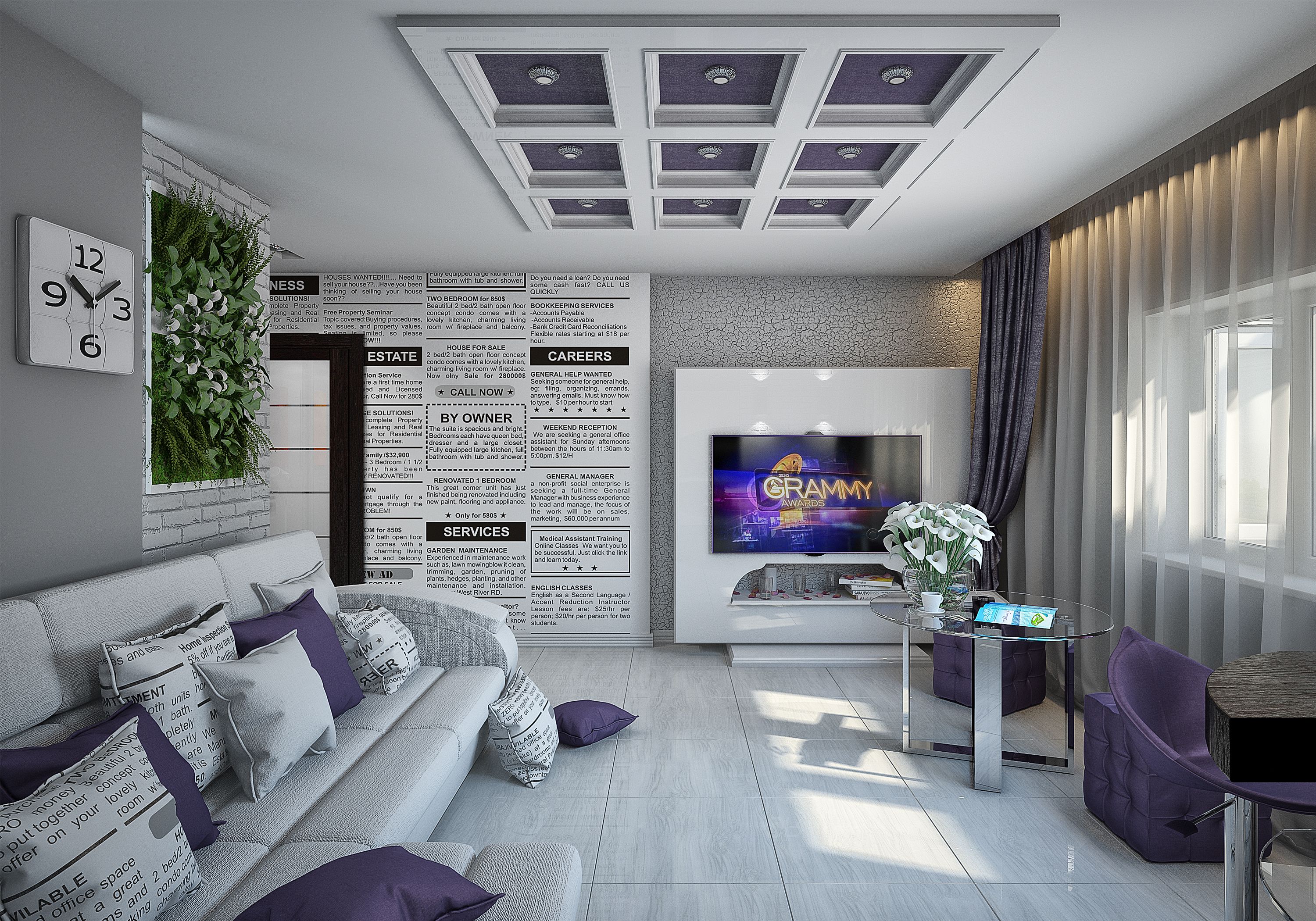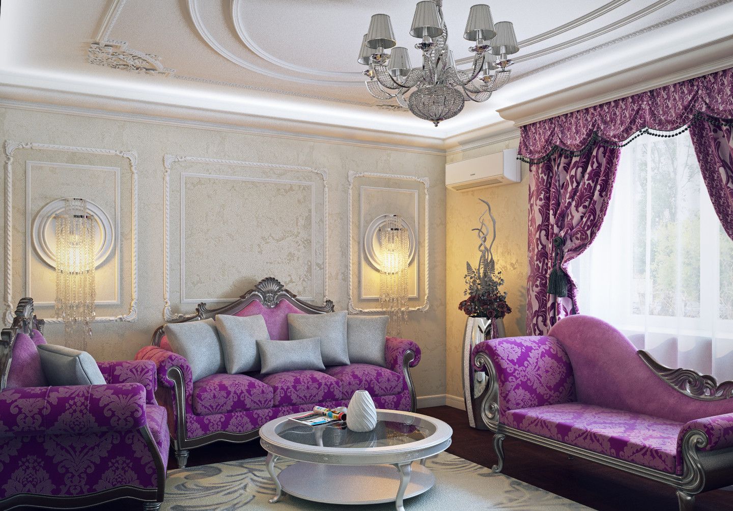 Apto para salones pequeños. Los tonos lilas de saturación ligera y media no reducen visualmente el espacio, por lo que pueden usarse en habitaciones pequeñas.