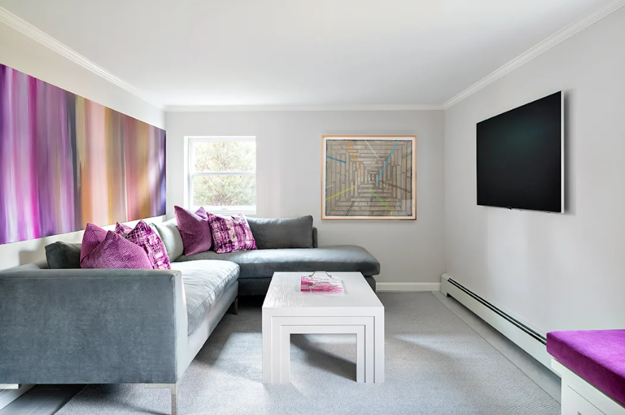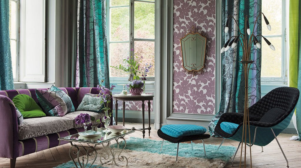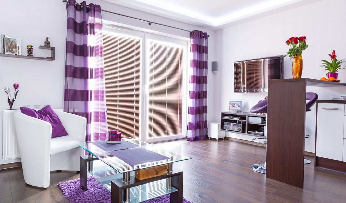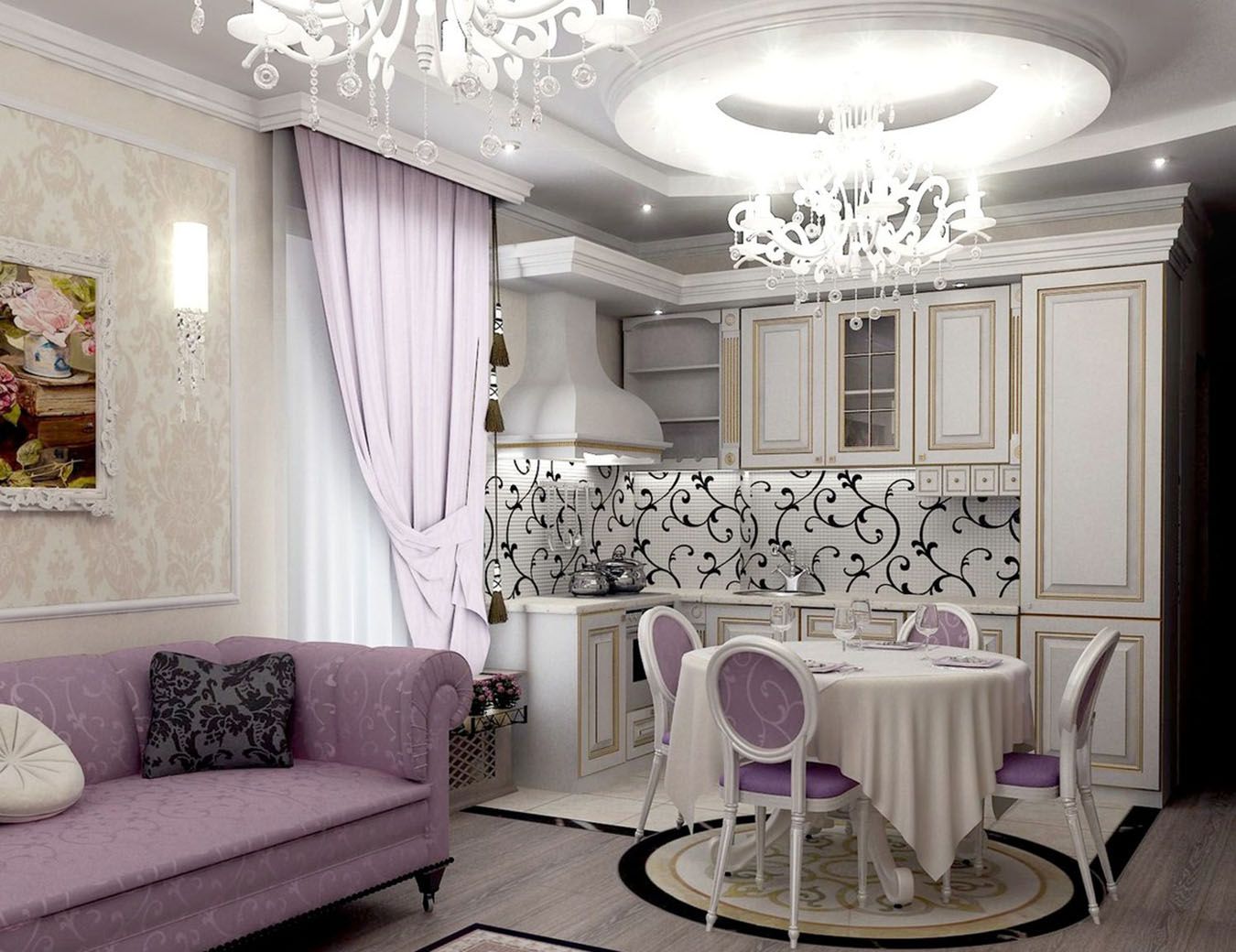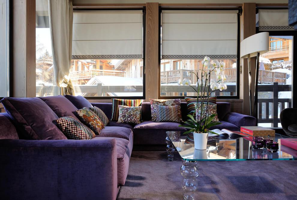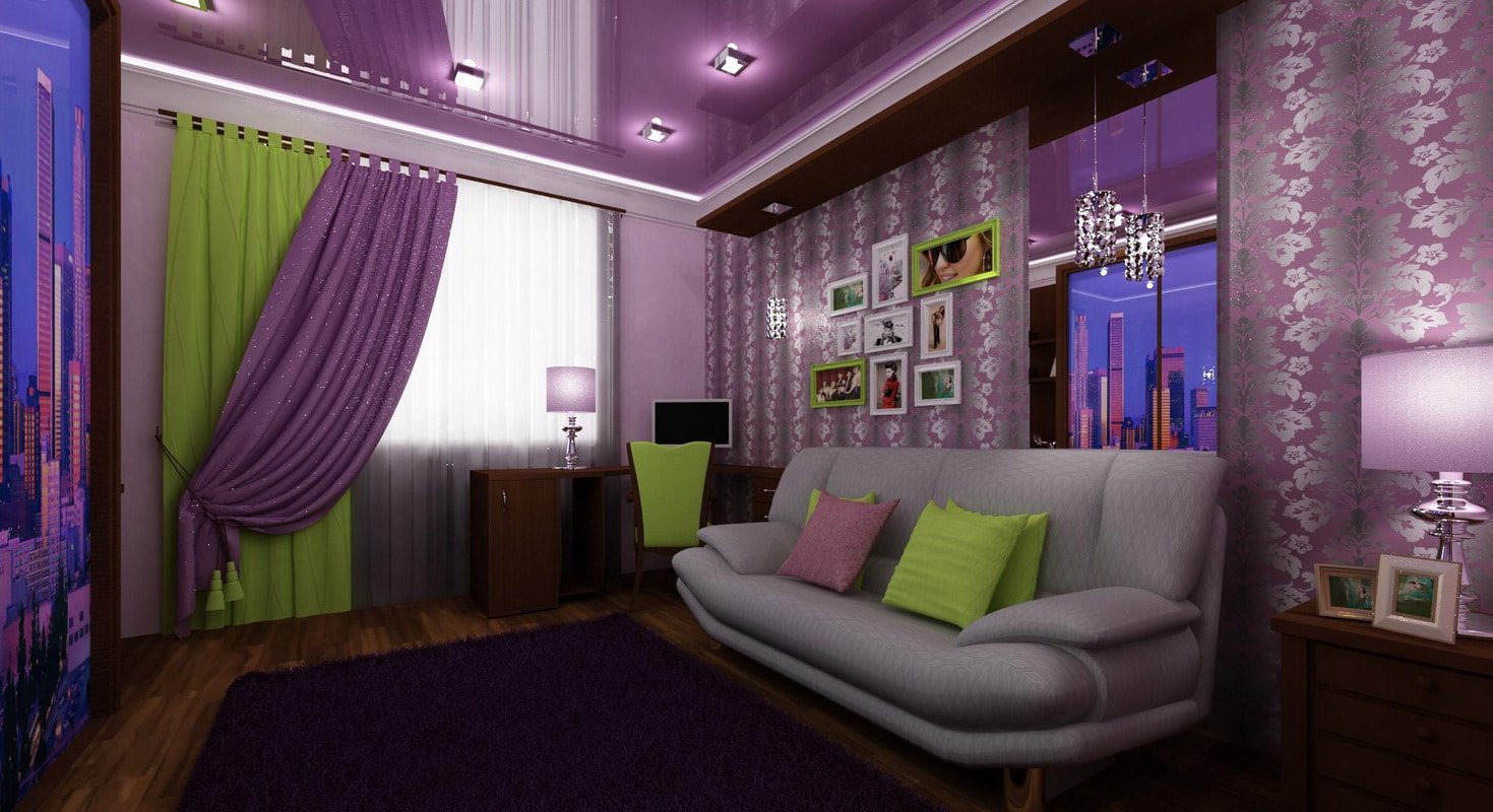 Apto para salones pequeños. Los tonos lilas de saturación ligera y media no reducen visualmente el espacio, por lo que pueden usarse en habitaciones pequeñas.