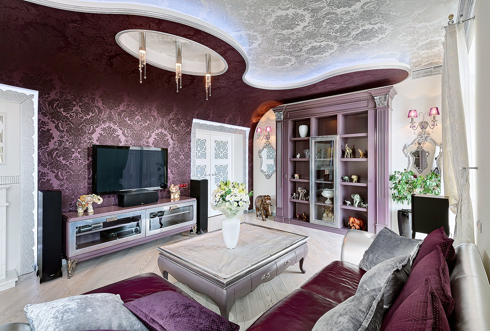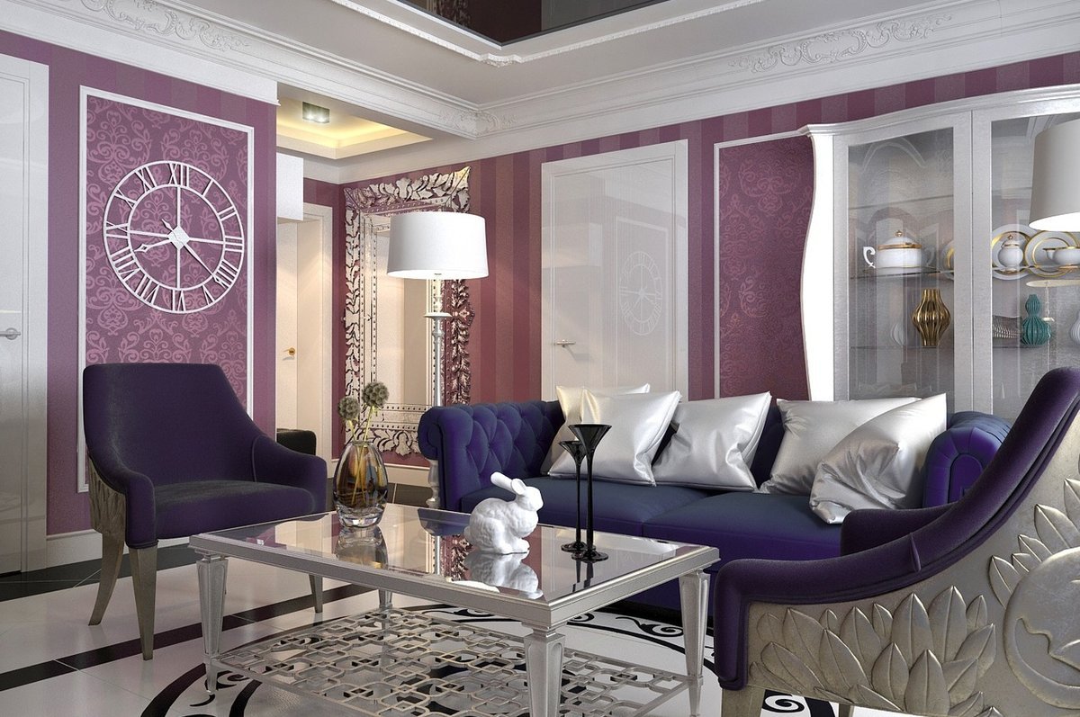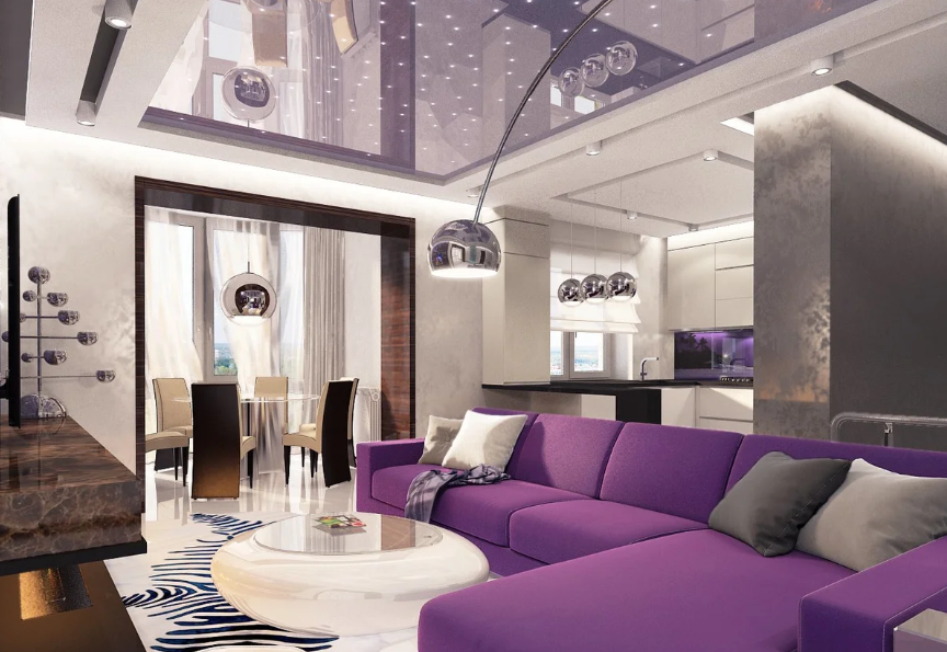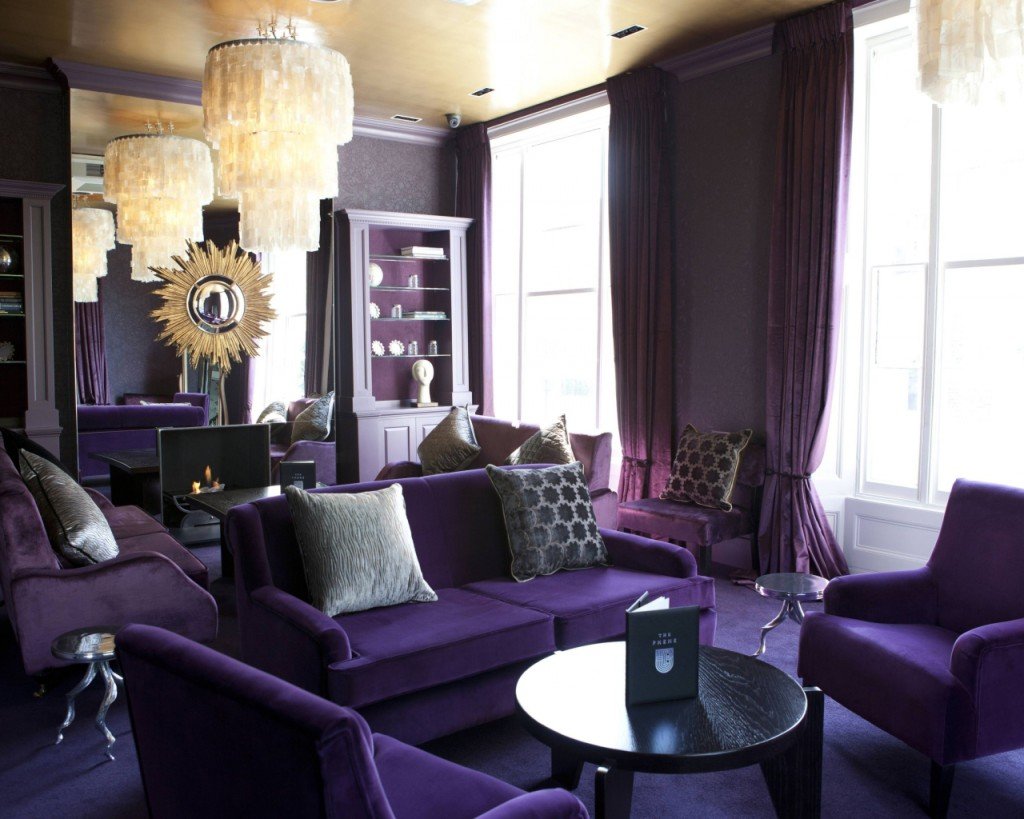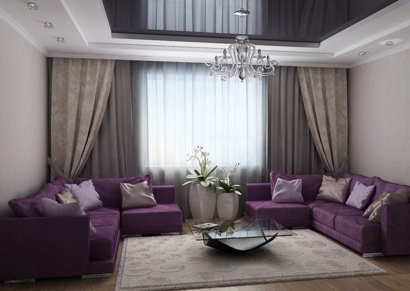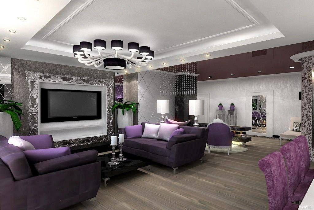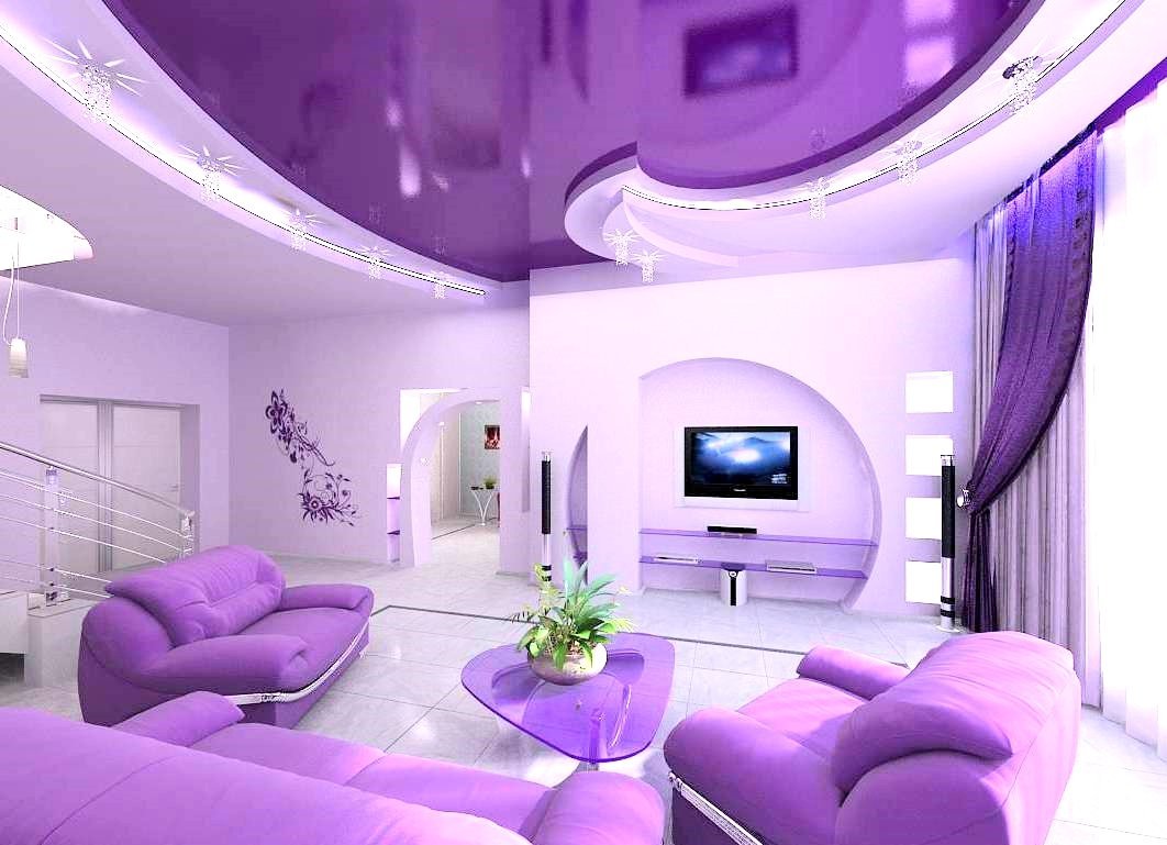 El salón lila siempre llama la atención por su originalidad. Está excluido de los conceptos estándar sobre el interior de la sala de estar y, por lo tanto, se vuelve único, no como los demás. Si prefiere soluciones no triviales, entonces la sala lila es la mejor manera de mostrar su personalidad.
