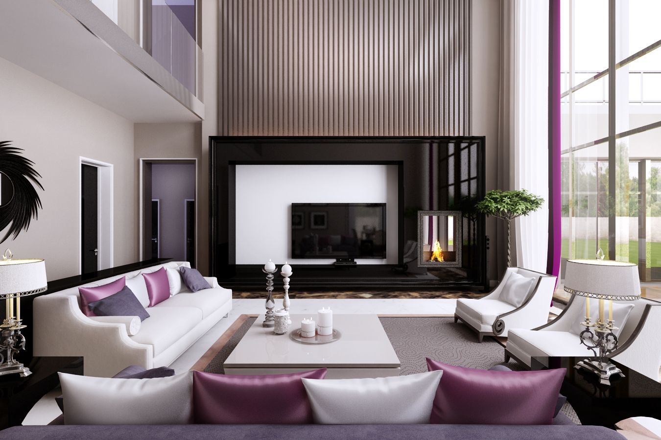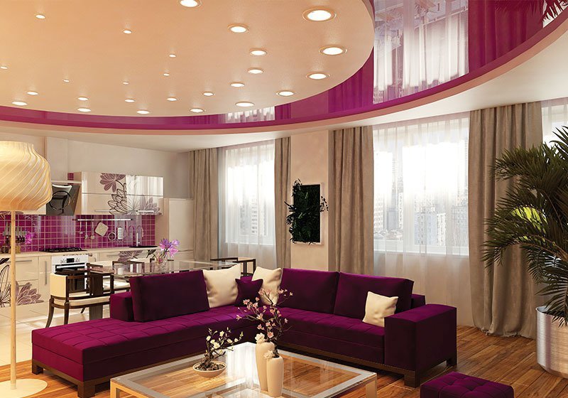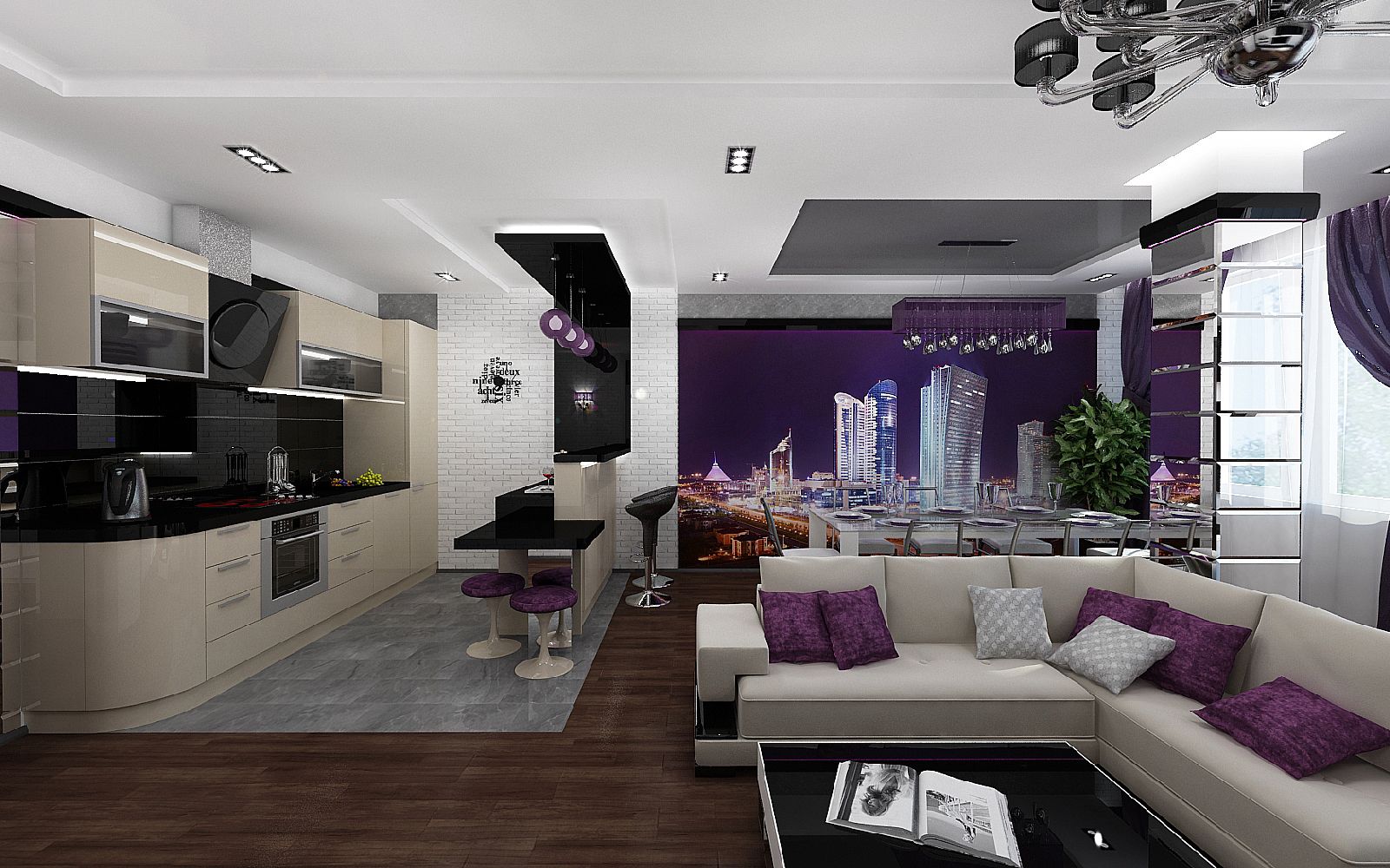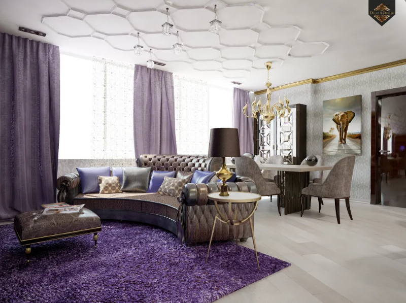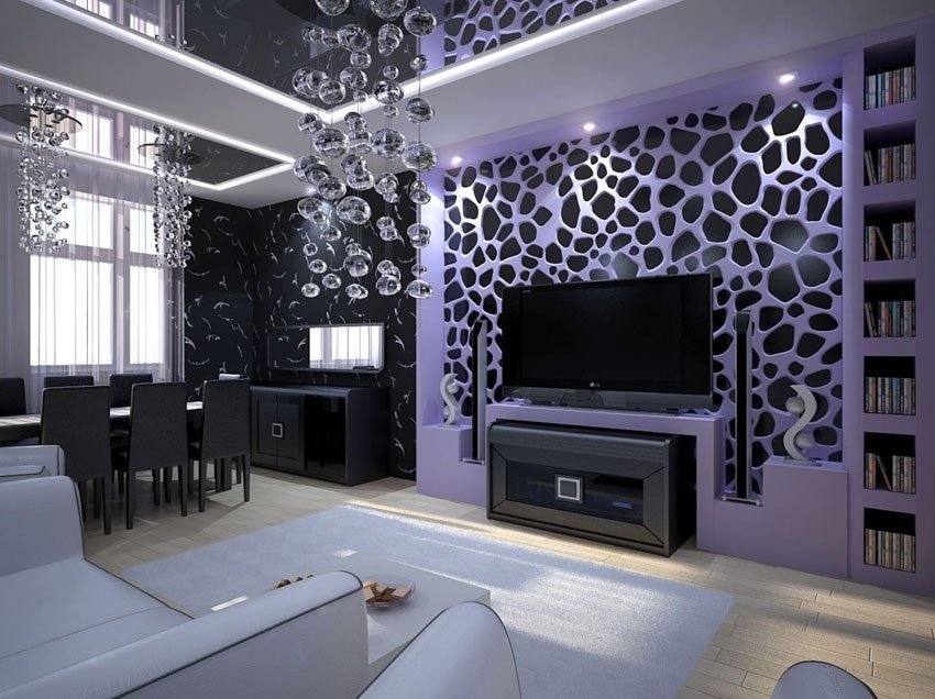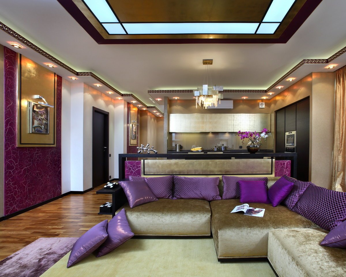 El salón lila siempre llama la atención por su originalidad. Está excluido de los conceptos estándar sobre el interior de la sala de estar y, por lo tanto, se vuelve único, no como los demás. Si prefiere soluciones no triviales, entonces la sala lila es la mejor manera de mostrar su personalidad.