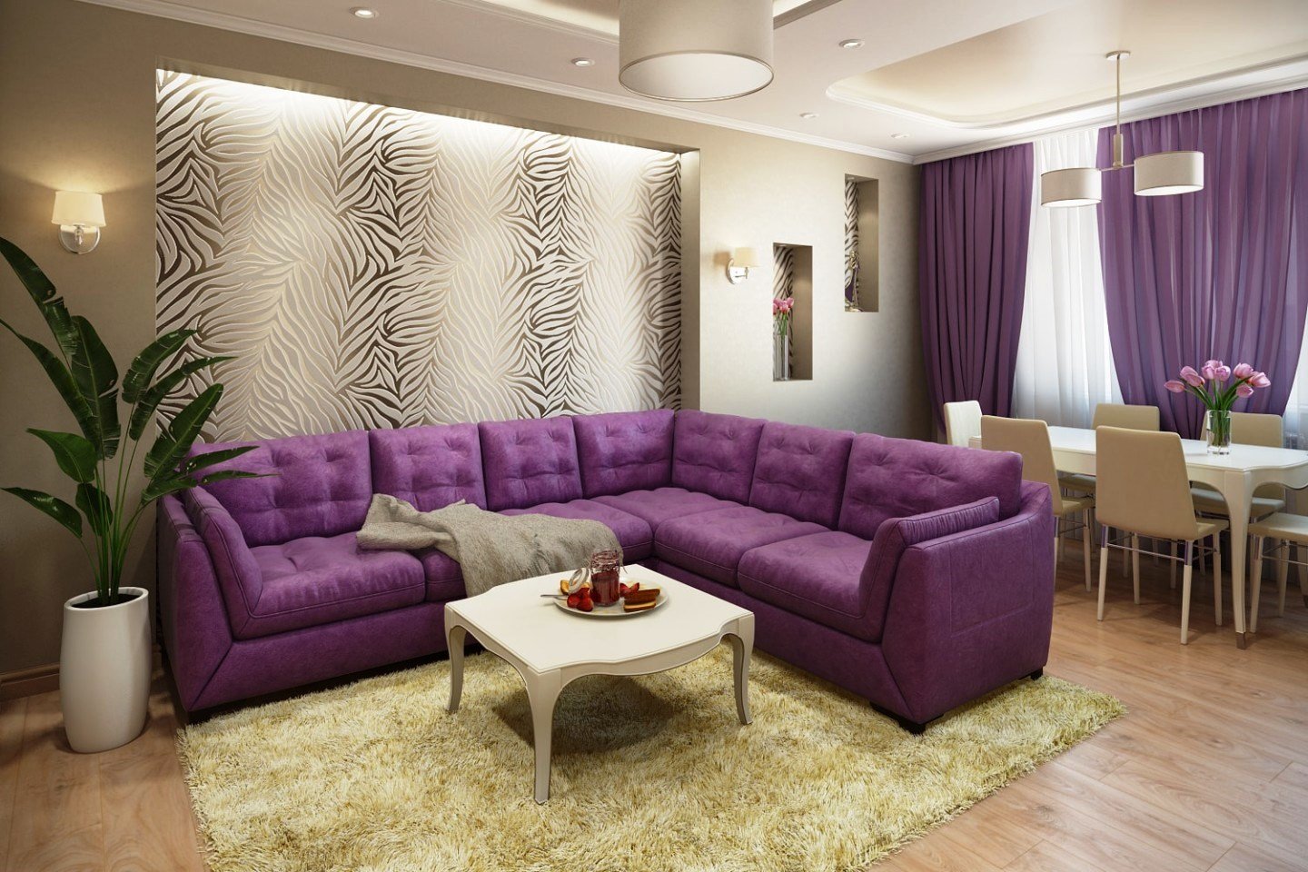Lila no es la opción más común para la decoración de interiores. La elección de este color indica la originalidad del propietario de la casa y su vena creativa. Al elegir muebles para una habitación, es importante crear un juego de contrastes: si las paredes son claras, entonces los muebles de tonos profundos se adaptarán a ellas y, por el contrario, la habitación oscura debe estar amueblada con muebles claros. Para el sofá beige puedes recoger almohadas lilas. Esta combinación será especialmente exitosa si se cuelgan cortinas en tonos morados en las ventanas.