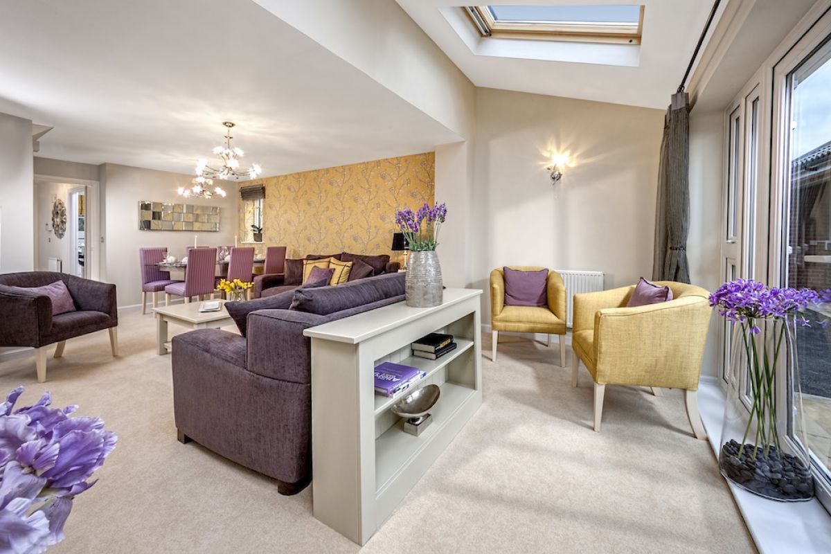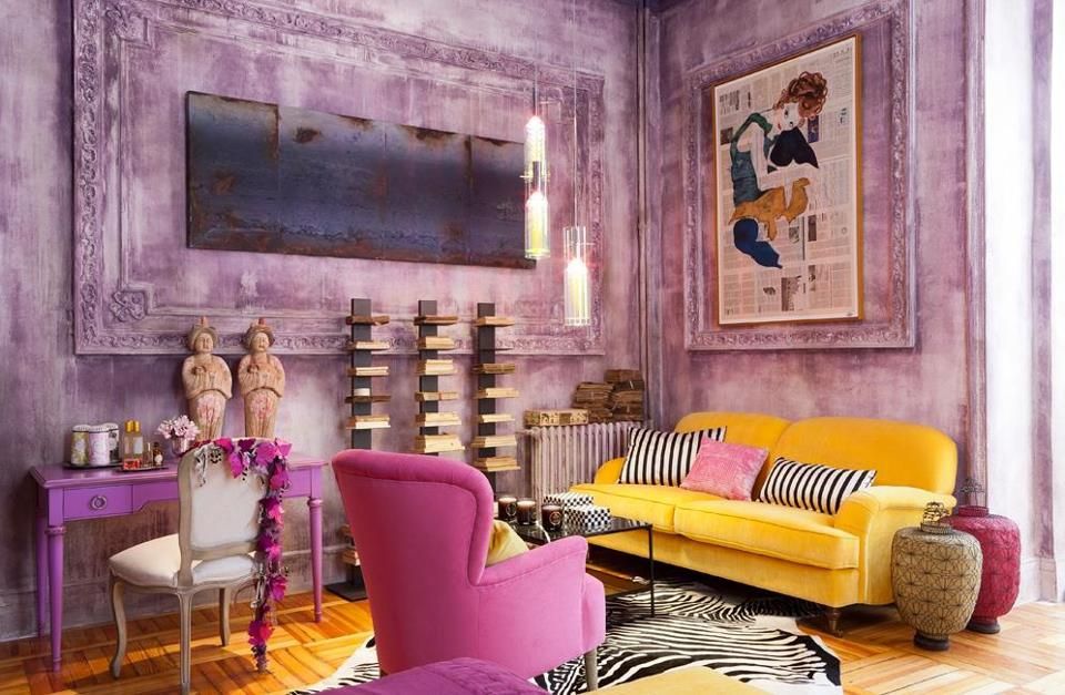 La sala de estar en tonos lilas evoca todo un caleidoscopio de asociaciones visuales: