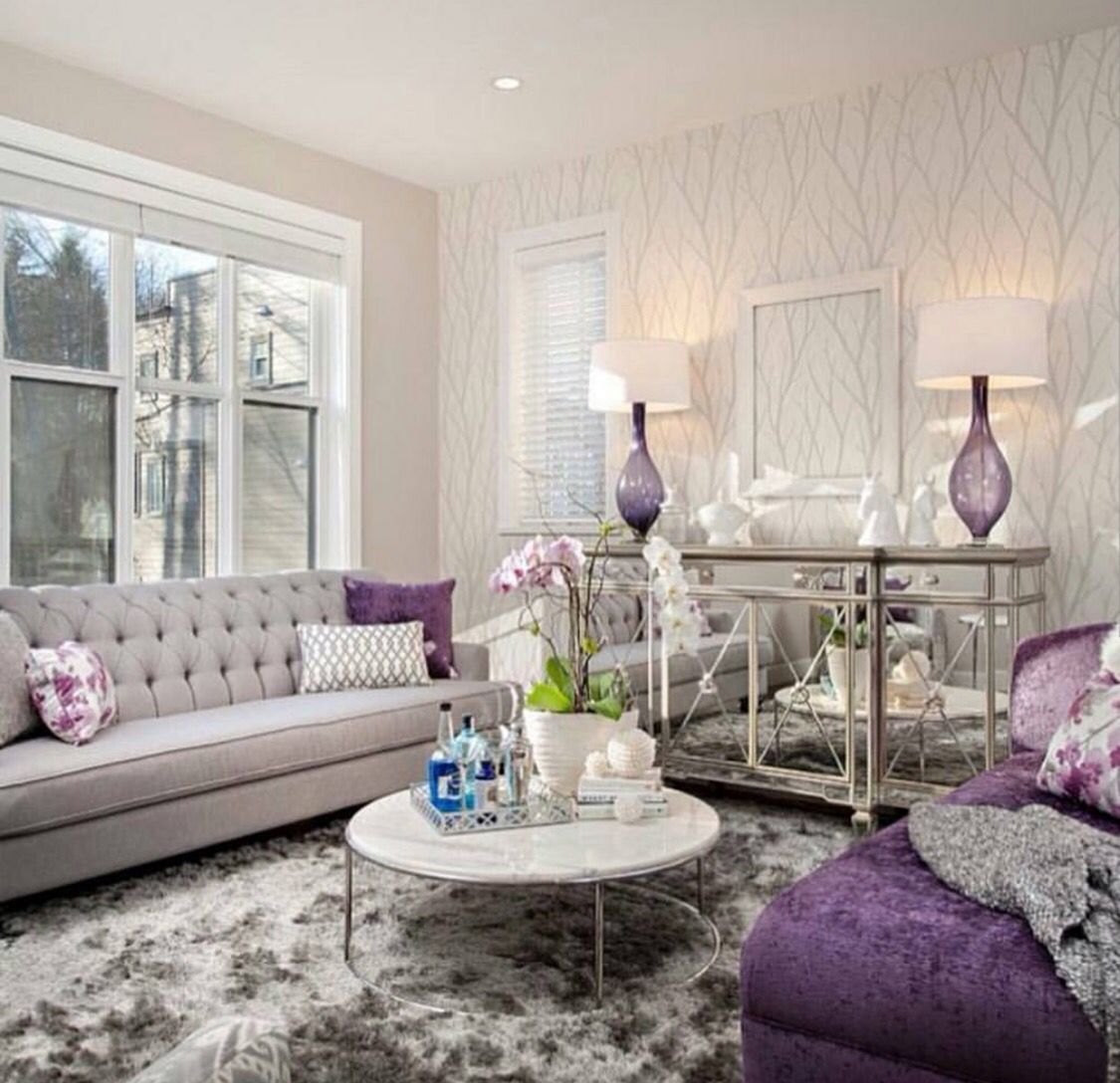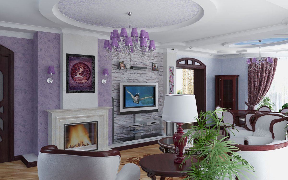 La sala de estar se puede cubrir completamente con papel tapiz lila. En este caso, es deseable resaltar alguna zona de la habitación con una sombra más profunda, y el resto del espacio debe estar decorado con colores brillantes.Pero es mejor no hacer las reparaciones completamente monocromáticas. La sala de estar se verá muchas veces más espectacular si agrega otros tonos a la lila. La forma más fácil es incluir beige o gris en el diseño.