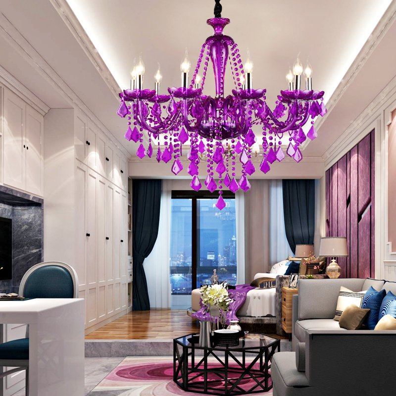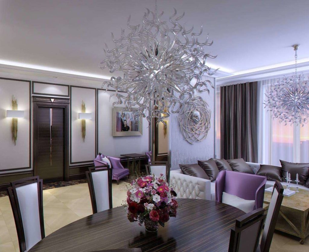 Art Decó. La iluminación en la sala lila Art Deco debe caer desde arriba.Las lámparas de pie y los apliques solo se pueden usar como fuentes de luz adicionales. La opción más beneficiosa para todos es la araña pretenciosa con una decoración lujosa: platos dorados, cuernos, bolas de cristal.