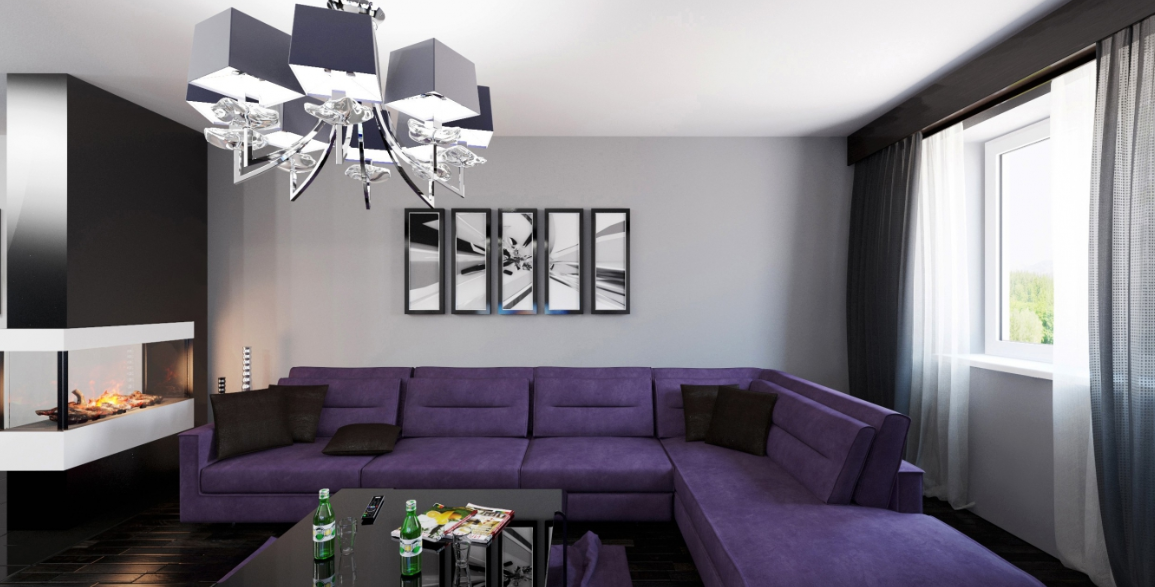 La elección de una lámpara depende del estilo del interior de la sala lila: