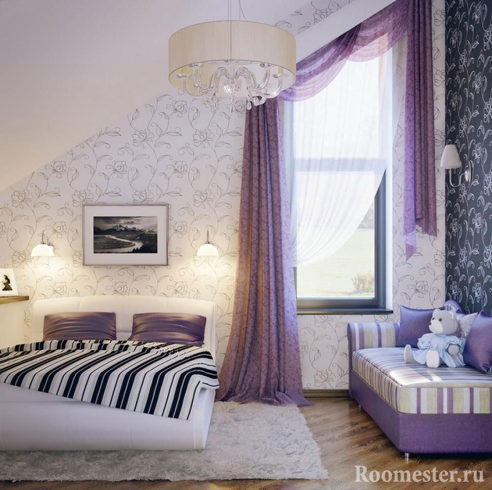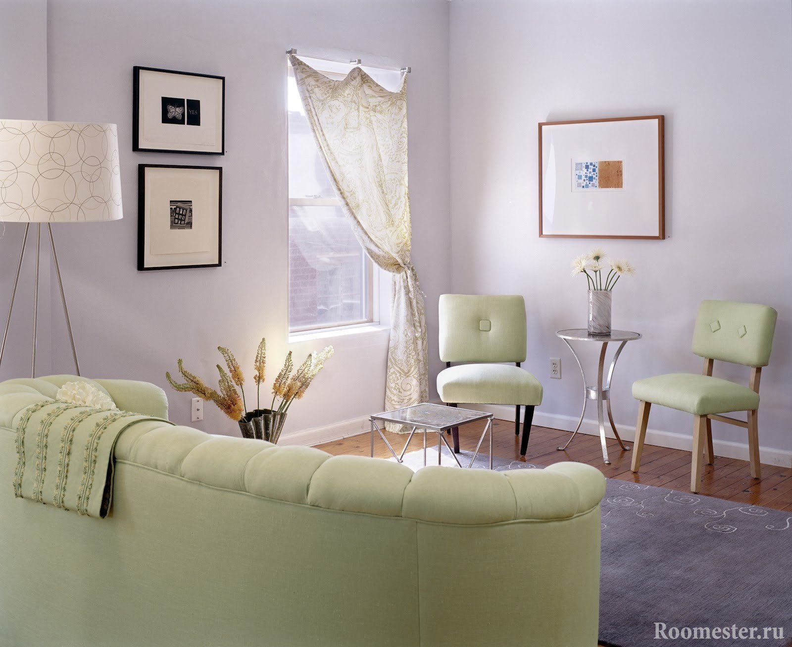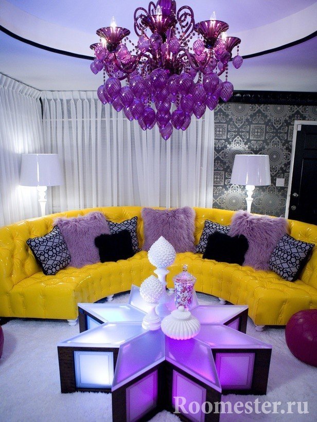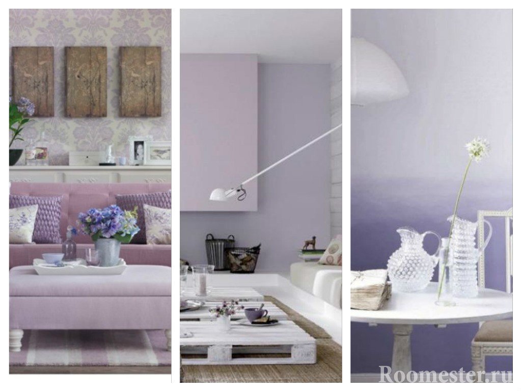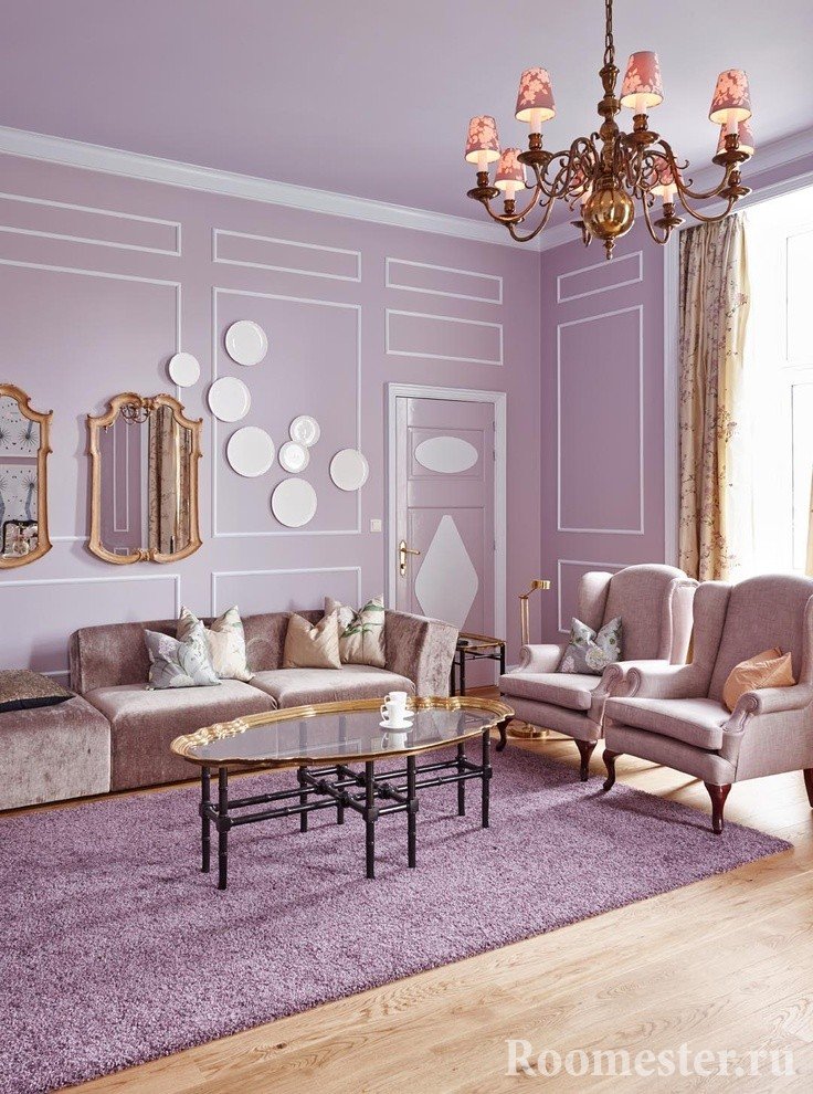 Decorando las paredes y el techo en un esquema de color lila claro, una de las paredes se puede hacer lila, púrpura, violeta brillante. Añadiendo crema, café, tonos blancos conseguimos un ambiente armonioso más confortable. Muebles tapizados, pequeños elementos interiores se mantienen en el mismo esquema de color. Un aplique, una pequeña otomana, almohadas decorativas se pueden hacer más brillantes, y las cortinas se deben colgar unos tonos más claros. Con la adición de colores negro y marrón, la sala de estar se verá mucho más estricta, y el blanco como la nieve dará minimalismo.