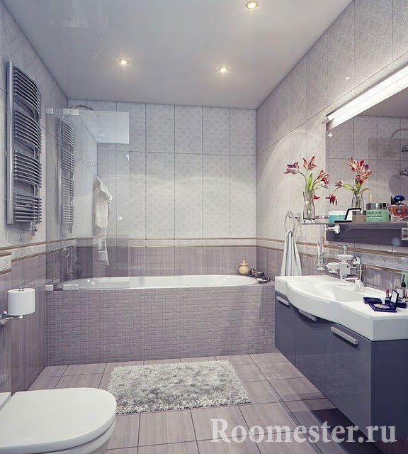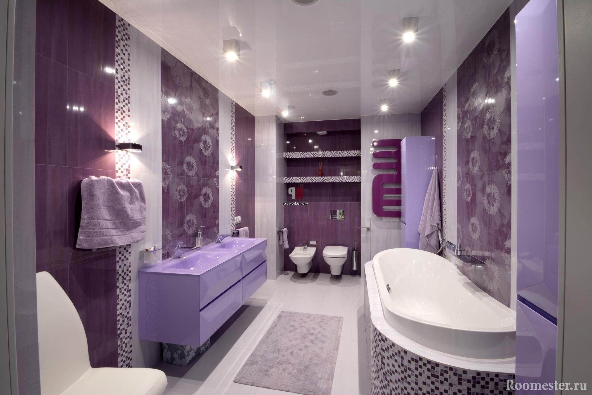 Si el espacio lo permite, puede decorar con pinturas, floreros, espejos, mesas de café. Dependiendo del tamaño del baño y del diseño, la iluminación se realiza, puede ocultarse y silenciarse o viceversa. Cualquiera sea la opción elegida, el diseño del baño en tonos lilas será relajante y armonioso.