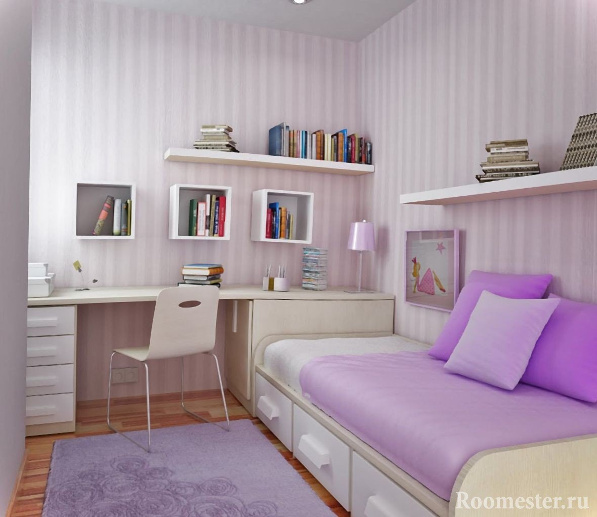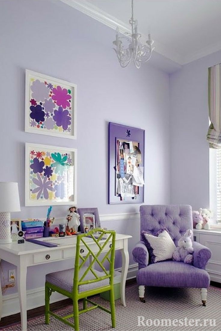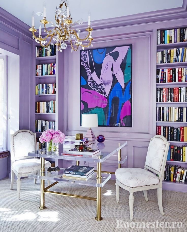 Sin embargo, no se les recomienda un estilo de oficina de trabajo o un comedor, un ambiente demasiado relajante solo molestará. En esta opción, es mejor enfatizar los ricos tonos lilas. Los colores pesados como el púrpura o el escarlata ejercerán presión sobre el propietario, por lo general, el énfasis está en cualquier mueble o en un fragmento de la habitación. Pero este también es un punto discutible, si el propietario de la oficina o la habitación de los adolescentes no está presionado por la saturación del color circundante, entonces puede y debe usar su paleta de colores favorita.
