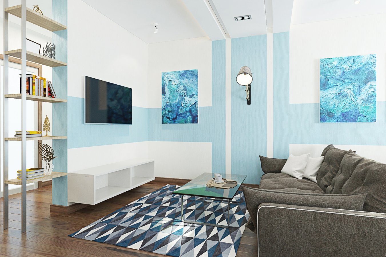 Las sombras de diferentes temperaturas pueden dar visualmente a la habitación la forma correcta. En una habitación estrecha, las paredes largas están teñidas de tonos fríos, las paredes cortas son cálidas, por lo que las paredes largas visualmente se separan y las paredes cortas se acercan. Al pintar el techo con tonos fríos, puede crear la ilusión de techos altos.