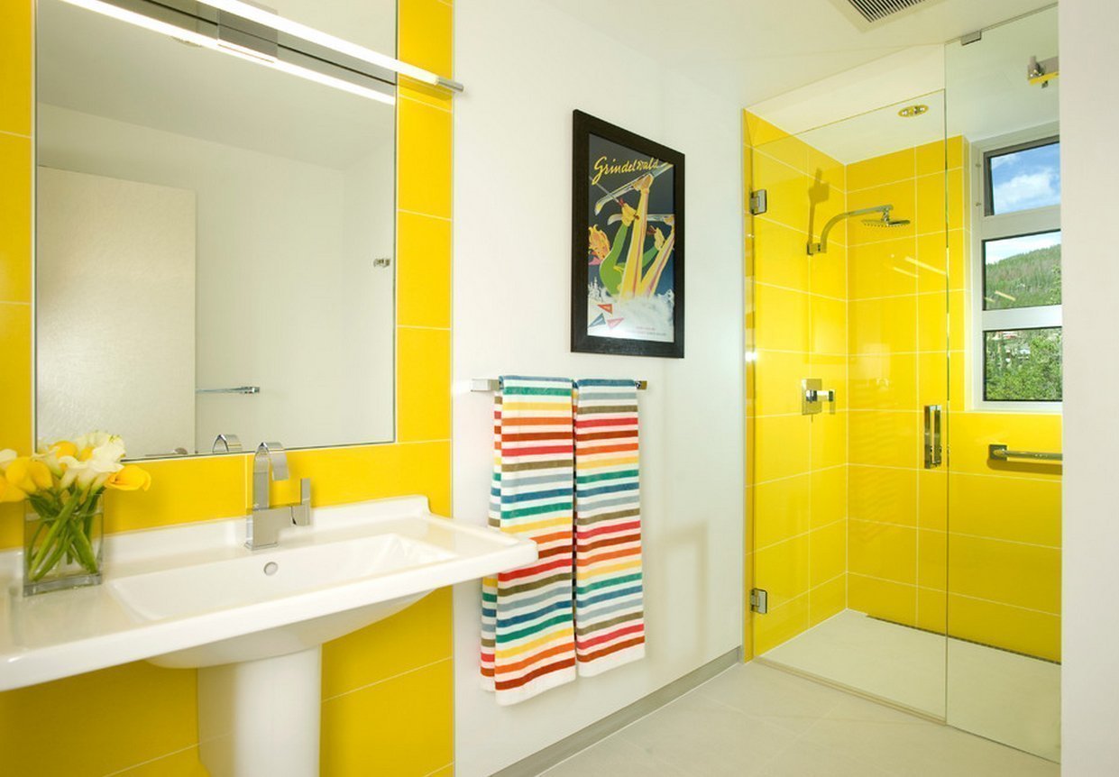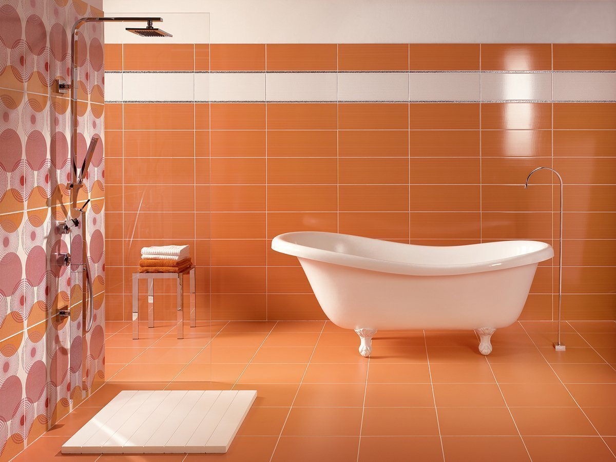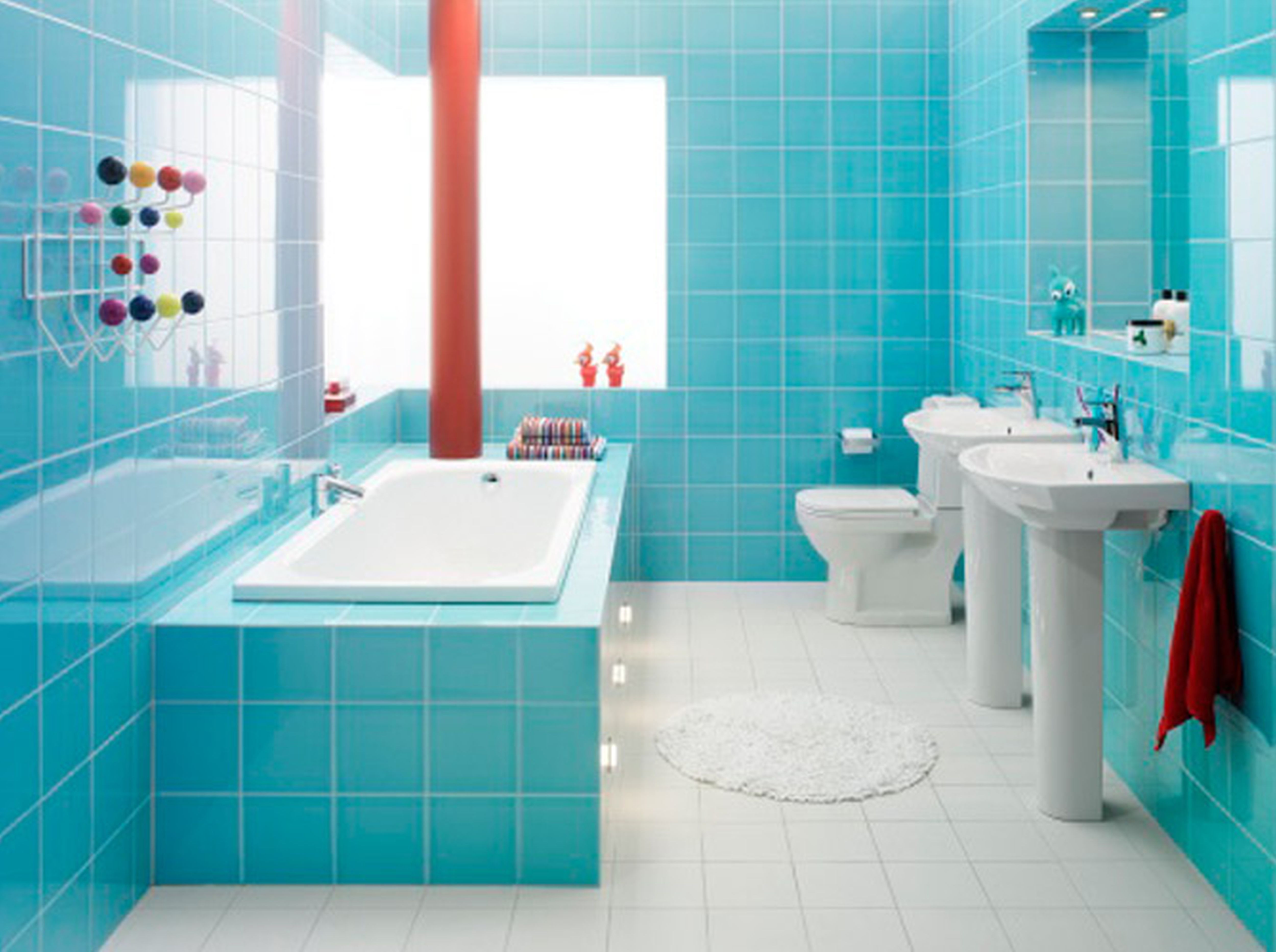 Dado que la plomería se realiza con mayor frecuencia en blanco, ya existe un color neutro en el baño para suavizar el brillo de los colores casi puros. La opción de combinar azulejos rojos, plomería blanca y textiles azules, así como elementos decorativos, así como elementos decorativos, puede resultar inusual y atractivo.