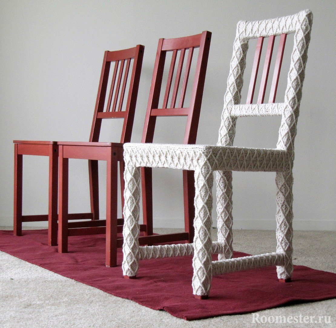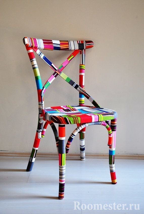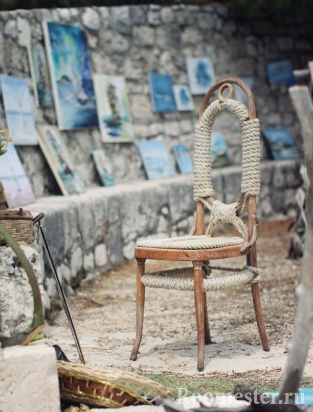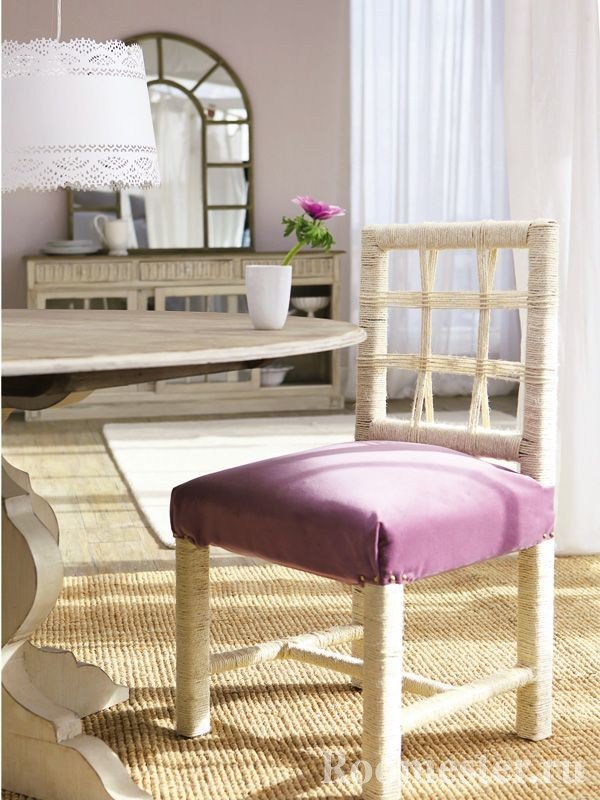 Esta opción se considera más adecuada para taburetes y sillas masivas. Aunque, si lo desea, puede intentar decorar muebles más sofisticados. La tapicería se retira de la silla y, para cada elemento individual (patas, barras transversales, manijas), se preparan piezas de hilo de la longitud requerida. La siguiente es una técnica simple: fije el extremo de la cuerda con una engrapadora o un clavo pequeño y comience a envolver el producto firmemente. El otro extremo se fija de manera similar. En la parte posterior de la silla, puede realizar un tejido simple, que se convertirá en una decoración notable.